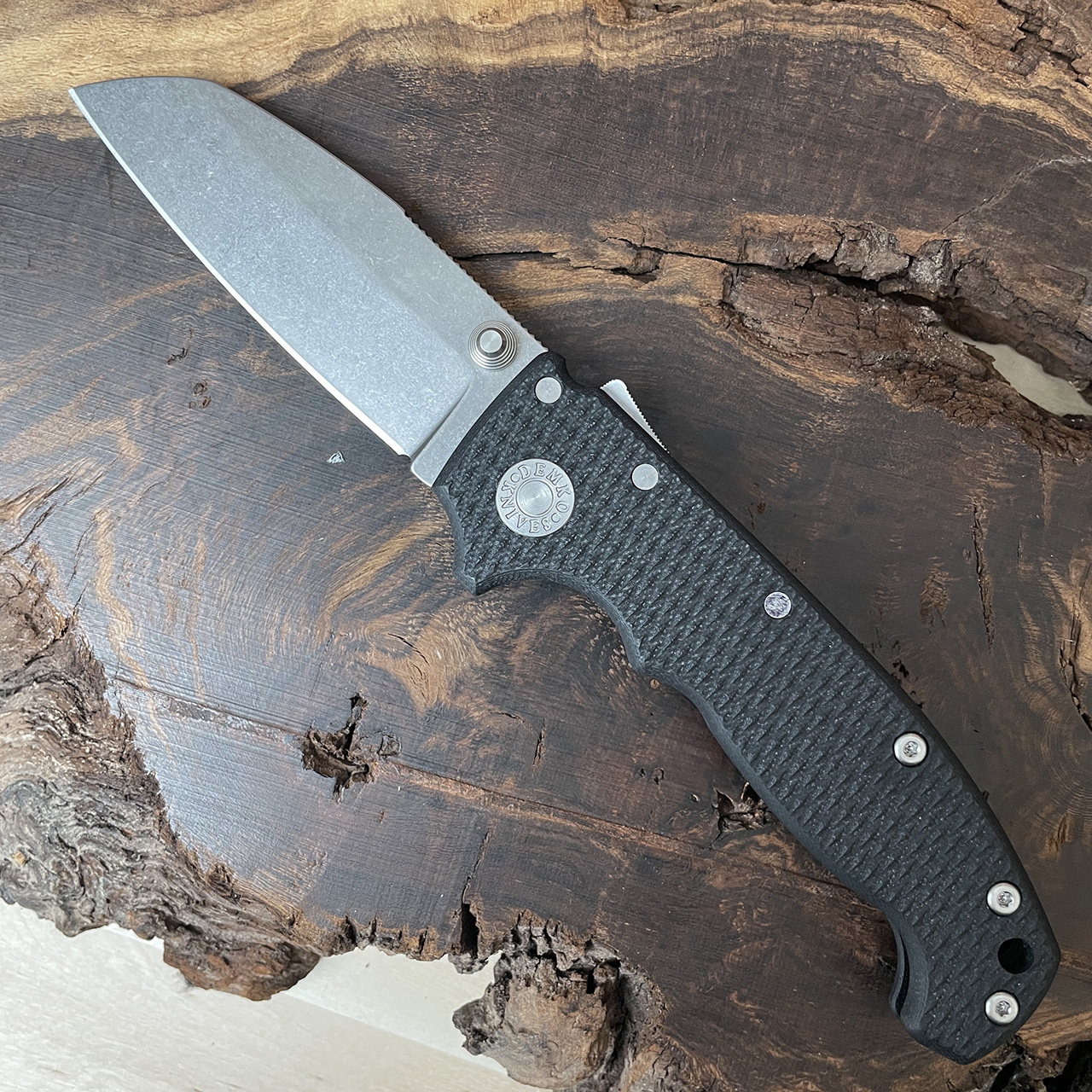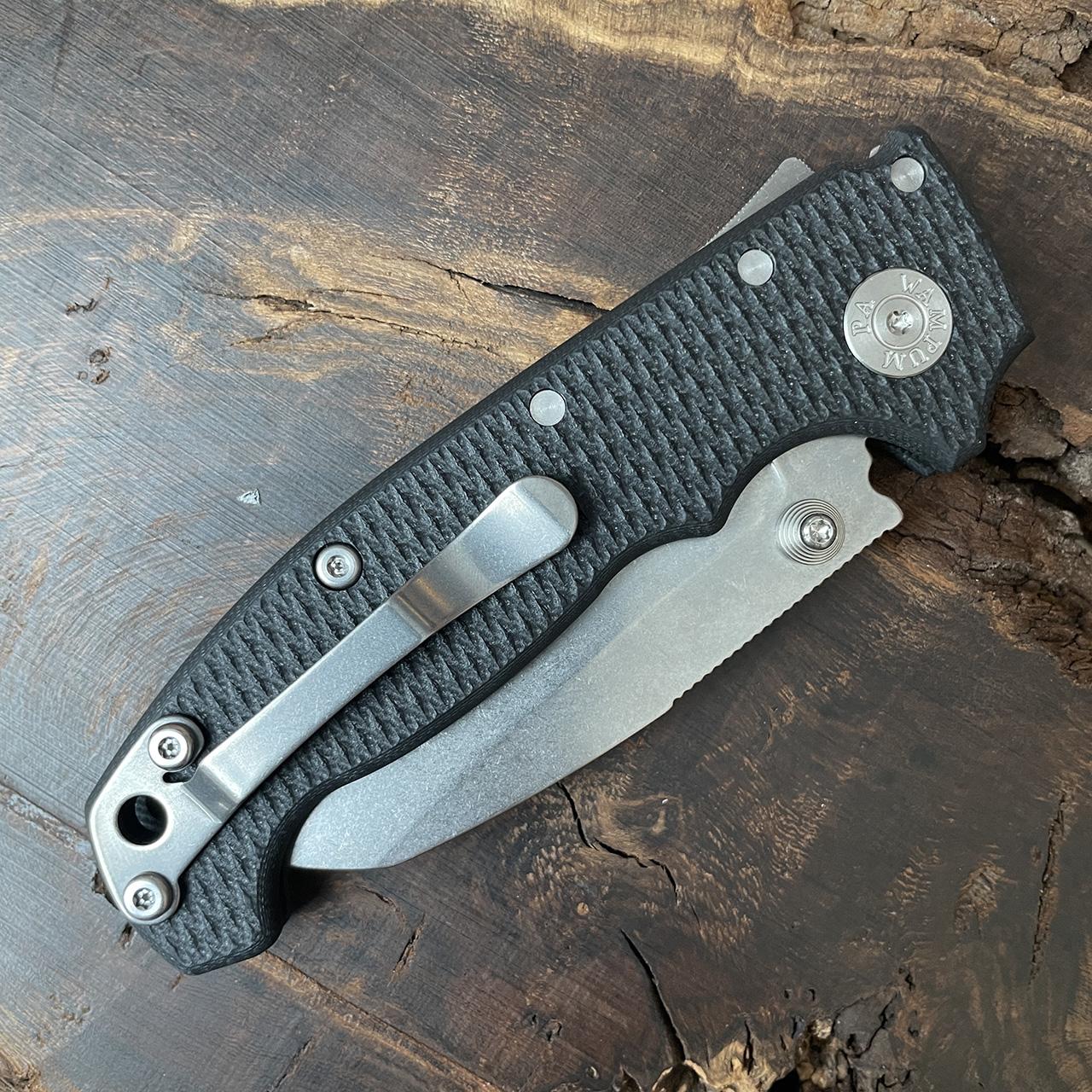 This model features black G-10 handle scales. Stonewash finished S45VN stainless steel shark foot style blade. Satin finished hardware and a stonewashed pocket clip. Brand new in box .