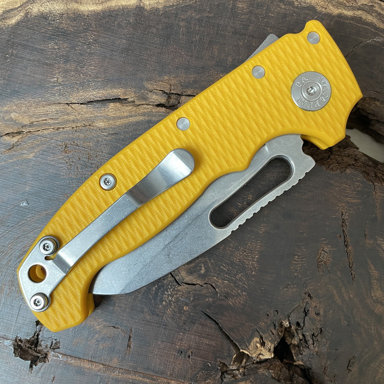 This model features mustard yellow G-10 handle scales. Stonewash finished M4 shark foot style blade. Satin finished hardware and a stonewashed pocket clip. Brand new in box .