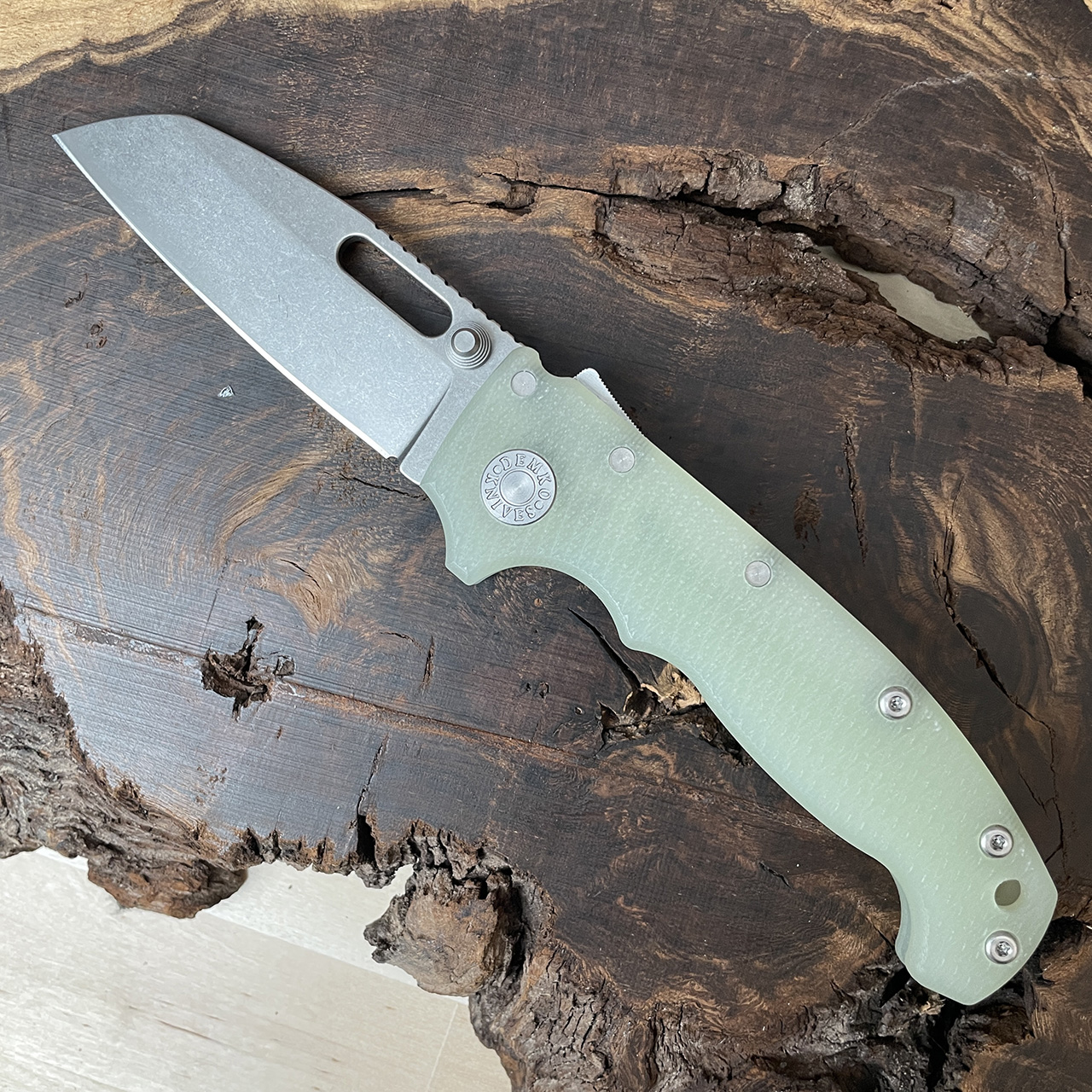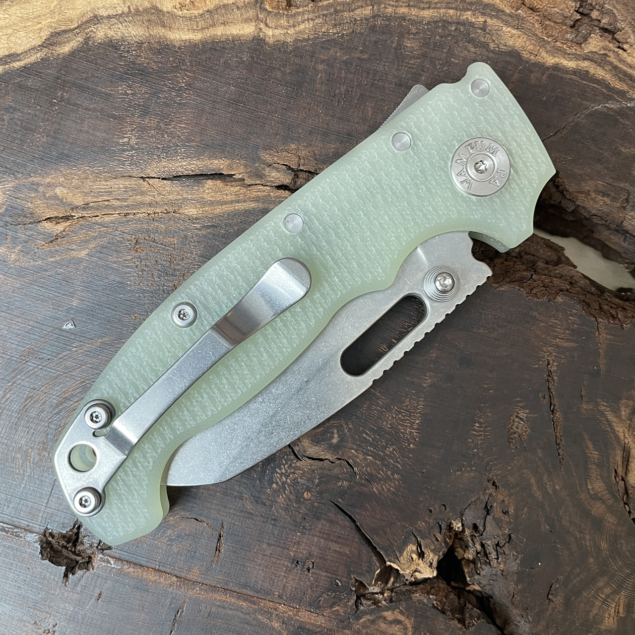This model features Natural Jade G-10 handle scales. Stonewash finished ELMAX stainless steel shark foot style blade. Satin finished hardware and a stonewashed pocket clip. Brand new in box .