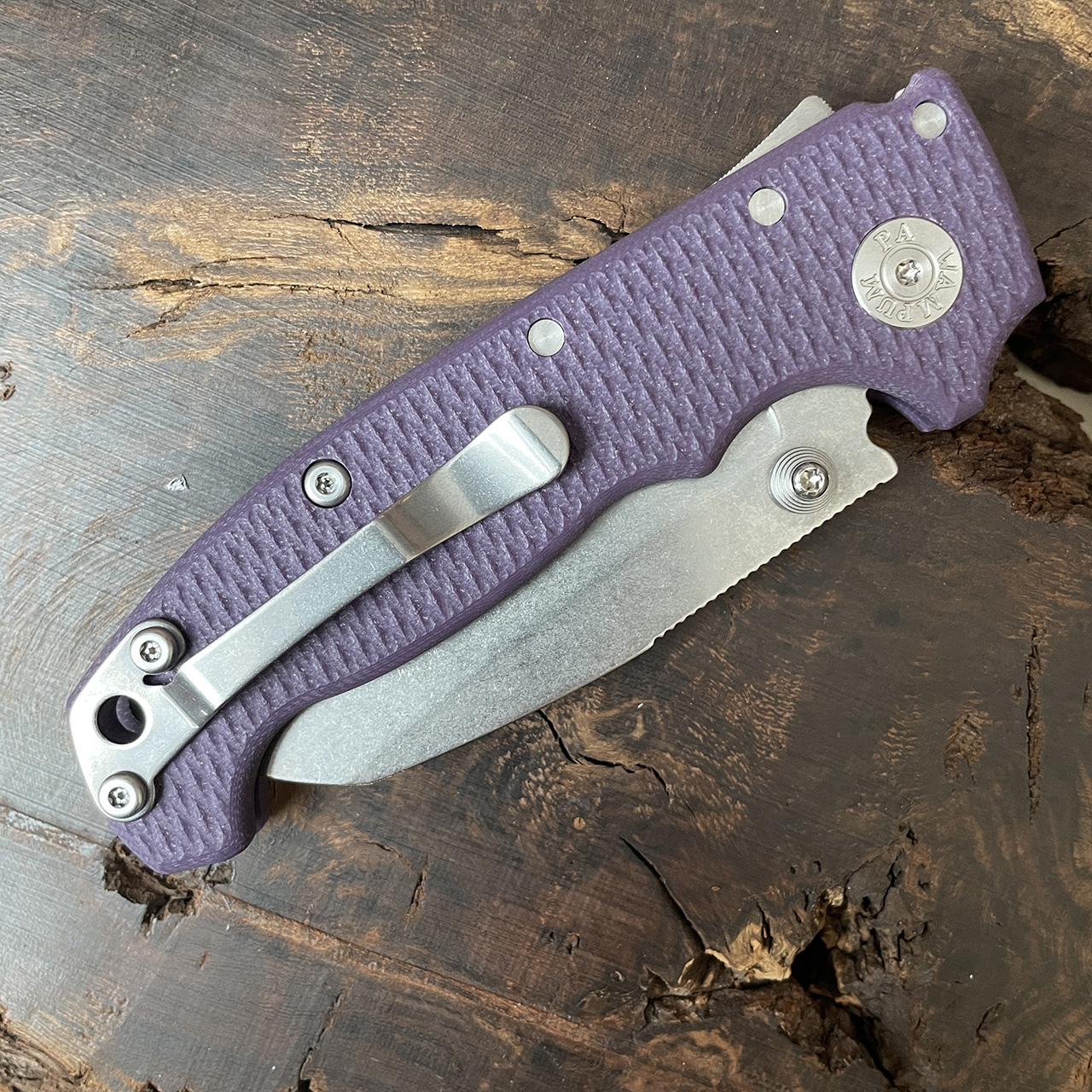 This model features purple G-10 handle scales. Stonewash finished S45VN stainless steel shark foot style blade. Satin finished hardware and a stonewashed pocket clip. Brand new in box .