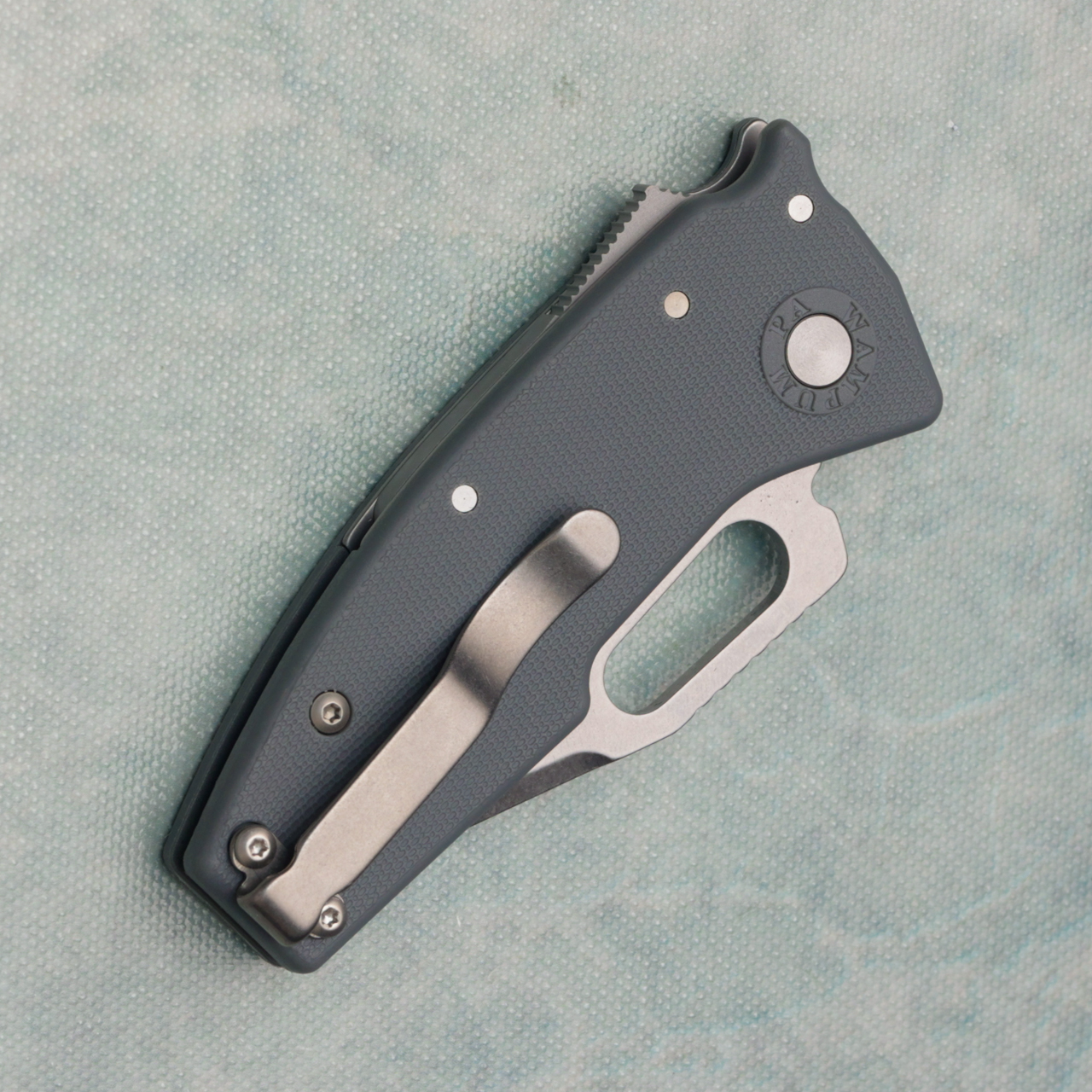 This model features gray GRN handle scales and a stonewash finished AUS10A stainless steel clip point blade. Brand new in box.