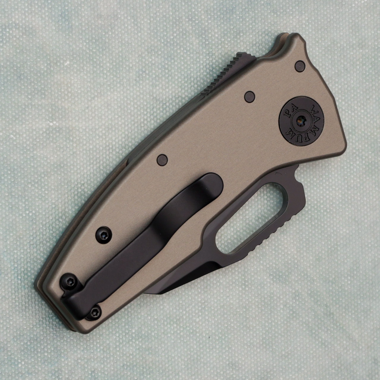 This model features artillery grey aluminum handle scales and a black finished CPM-20CV stainless steel shark foot style blade. Brand new in tube.