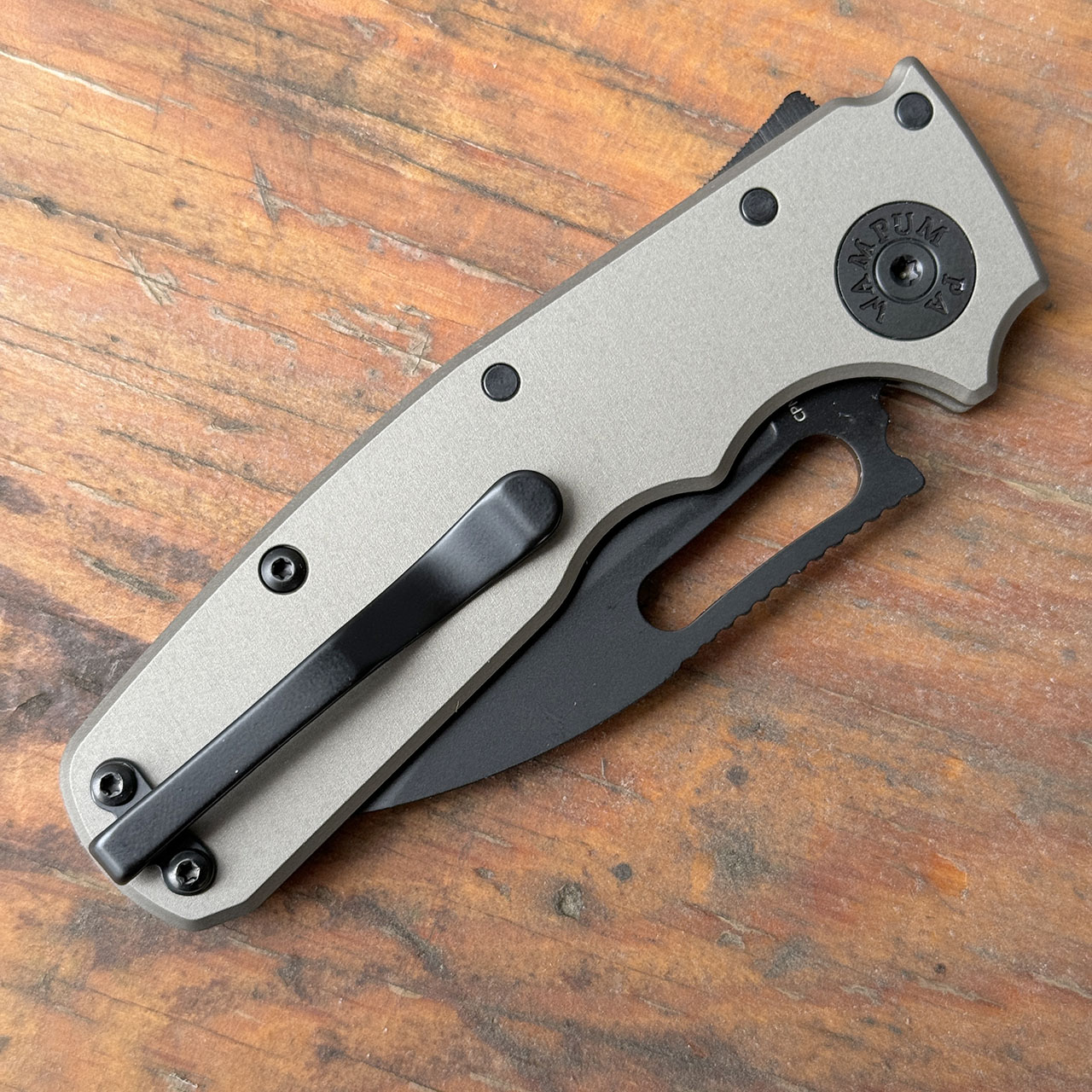 This model features artillery grey aluminum handle scales and a DLC finished CPM-20CV stainless steel slicer style blade. Brand new in tube.