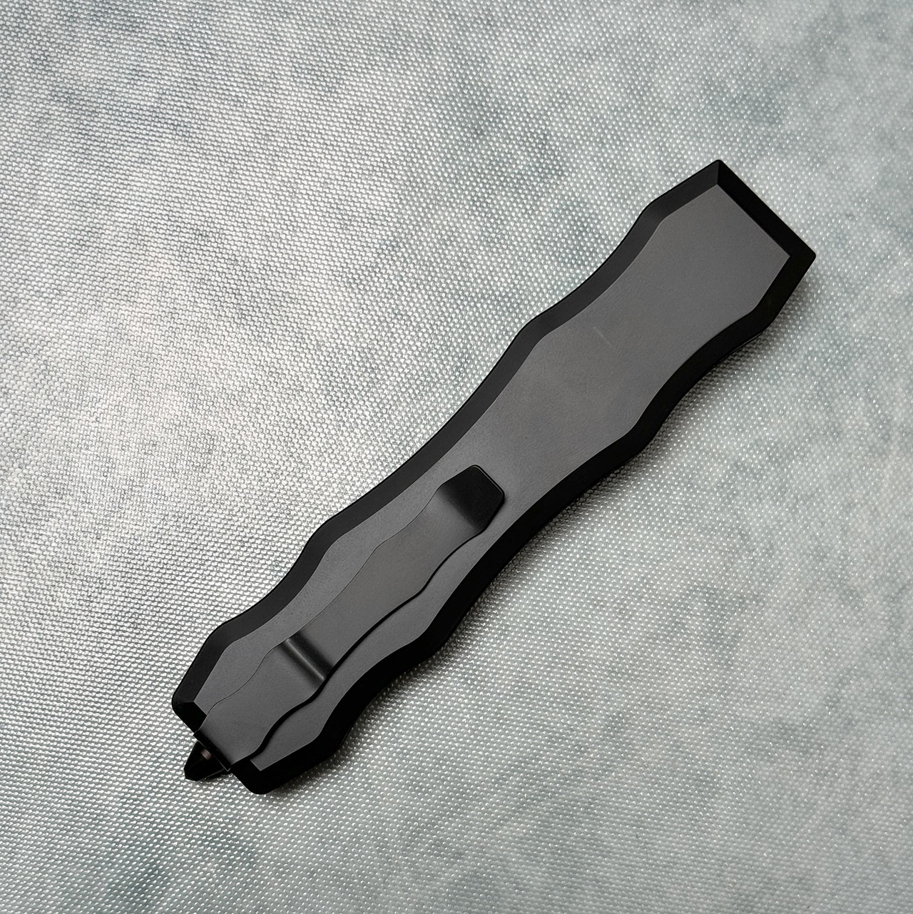 A fantastic remake of the out-the-front double action auto by Desert Knife Works. Ergonomic DLC stainless steel handle, the front has a shark engraved on the bottom. DLC finished M390 stainless steel double edge dagger blade with drain holes and harpoon style cuts at the base. Stepped firing button. Incredibly smooth and positive action with solid lockup. Made in China. Brand new in true to original tube with vevlet slip. Limited run of 400 pieces.