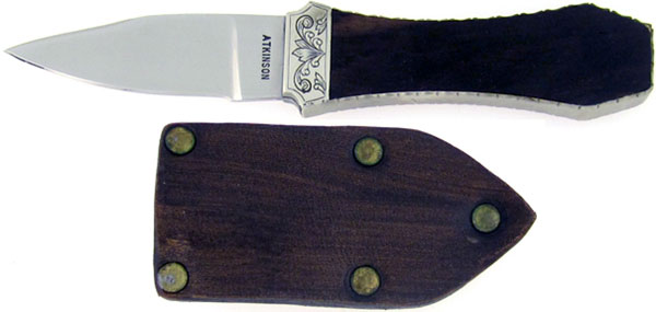 Awesome fancy engraved and file worked nickel silver handle with dark hardwood inlays. Mirror polished stainless steel single edge clip point dagger blade. Tang stamped ATKINSON. The picture says it all, this piece is a beauty. Comes mint with leather riveted boot clip sheath.