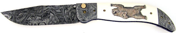 Beautiful genuine elephant ivory handle scales that are scrimshawed, the front with a detailed Grizzly Bear, and the back with Bear tracks. All the scrimshaw work was done by Tina Hanson Don's wife. Awesome mosaic damascus clip point blade, bolsters, and blade release. Elegantly file worked titanium liners. Titanium back spring. Nice 14k gold button and screws. Beautiful custom Don Hanson automatic knife. One super high quality Heirloom Automatic knife in a highly sought after Ka-bar Grizzly pattern.