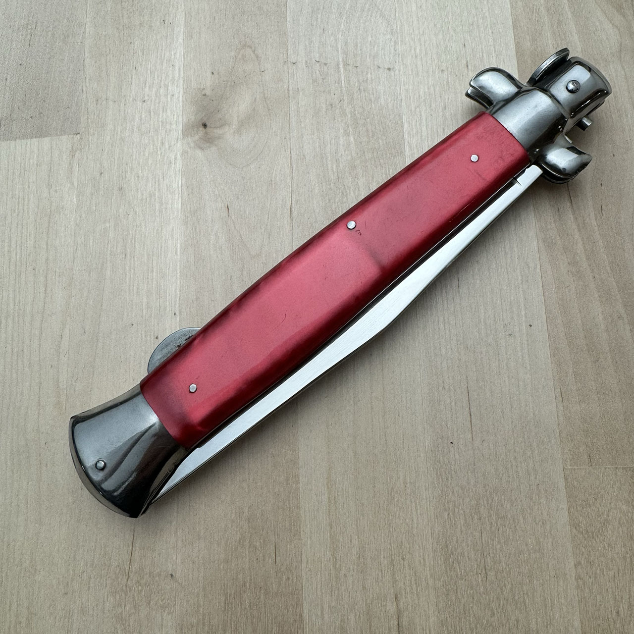 Old Discontinued Edge Company Knife. Pretty red celluloid handle scales. Mirror polished large stainless steel clip point blade. Fancy stainless steel bolsters, liners, and handle pins. Cool jumbo Italian stiletto lock back knife.
