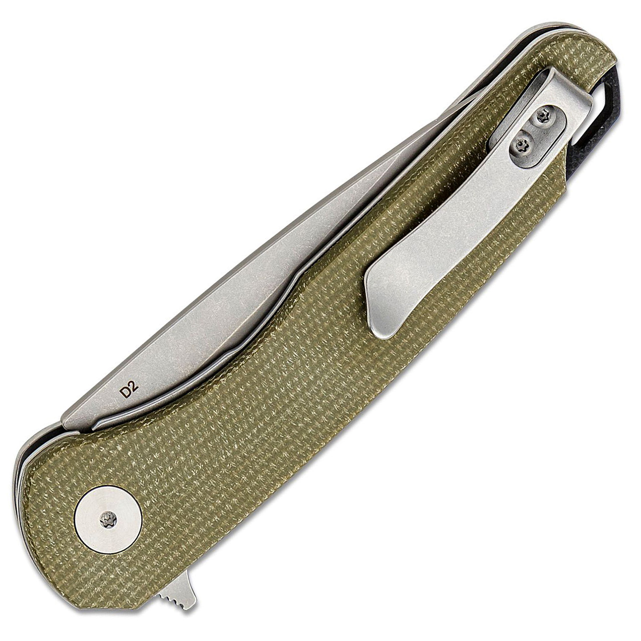 This version features a green canvas micarta handle and a stonewash D2 drop point blade with a plain edge. Comes brand new in the box. Brand new in box.