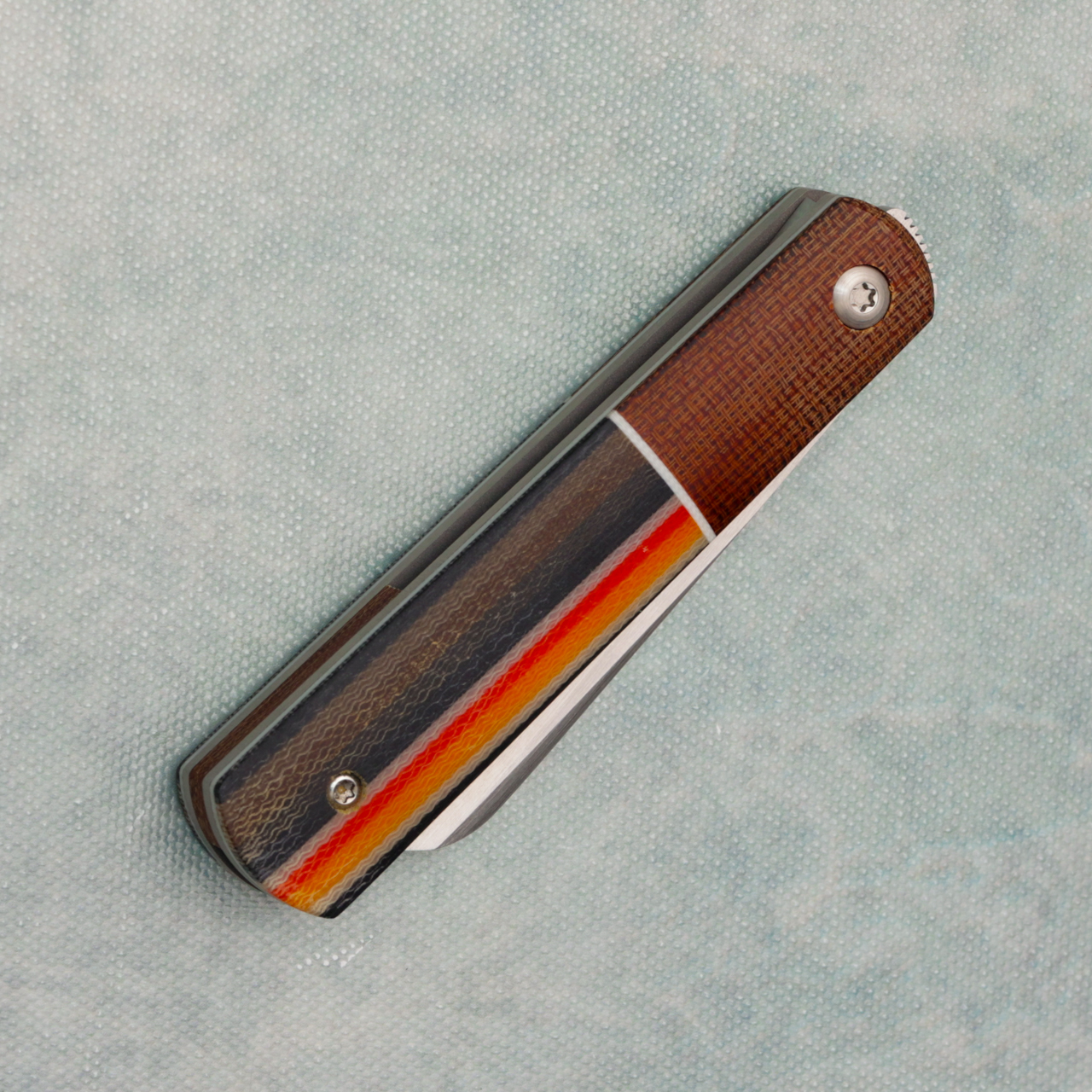 The Barlow sheepsfoot is a small pocket sized edc. The front flipper is very smooth. Satin CPM-154 satin blade with two different micartas in the scales. New in pouch.