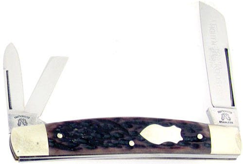 Pretty dark brown jigged bone handle scales. Mirror polished stainless steel sheepsfoot blade etched FIGHT'N ROOSTER, small coping blade, and pen blade. All blades have good strong snap, long nail pulls, are swedged, and tang stamped. Brass liners. Nickel silver bolsters, handle pins, and inlaid crest shield. Beautiful Fight'N Rooster pocket knife by Frank Buster Celebrated Cutlery.