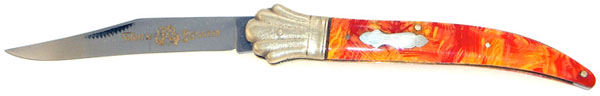 Awesome fire burst celluloid handles. High polished stainless steel clip point blade with a nice gold etch that says FIGHT'N ROOSTER TM with the Fighting Rooster logo. Brass liners. Nice match striker nail knick. Fancy fluted antique sand casted nickel silver bolsters. Nickel silver handle pins and inlaid shield. Sweet Frank Buster Cutlery Company Fight'n Rooster pocket knife.