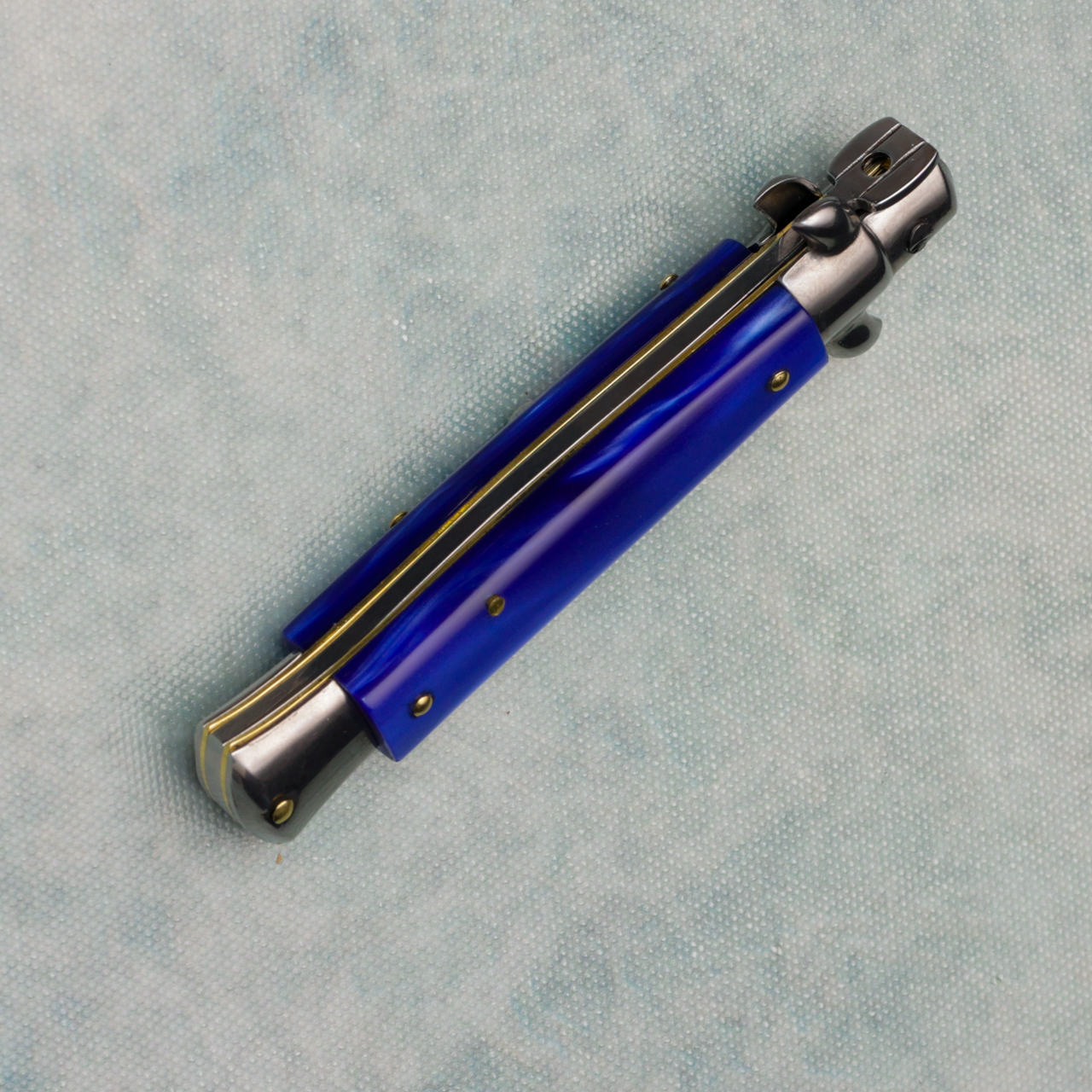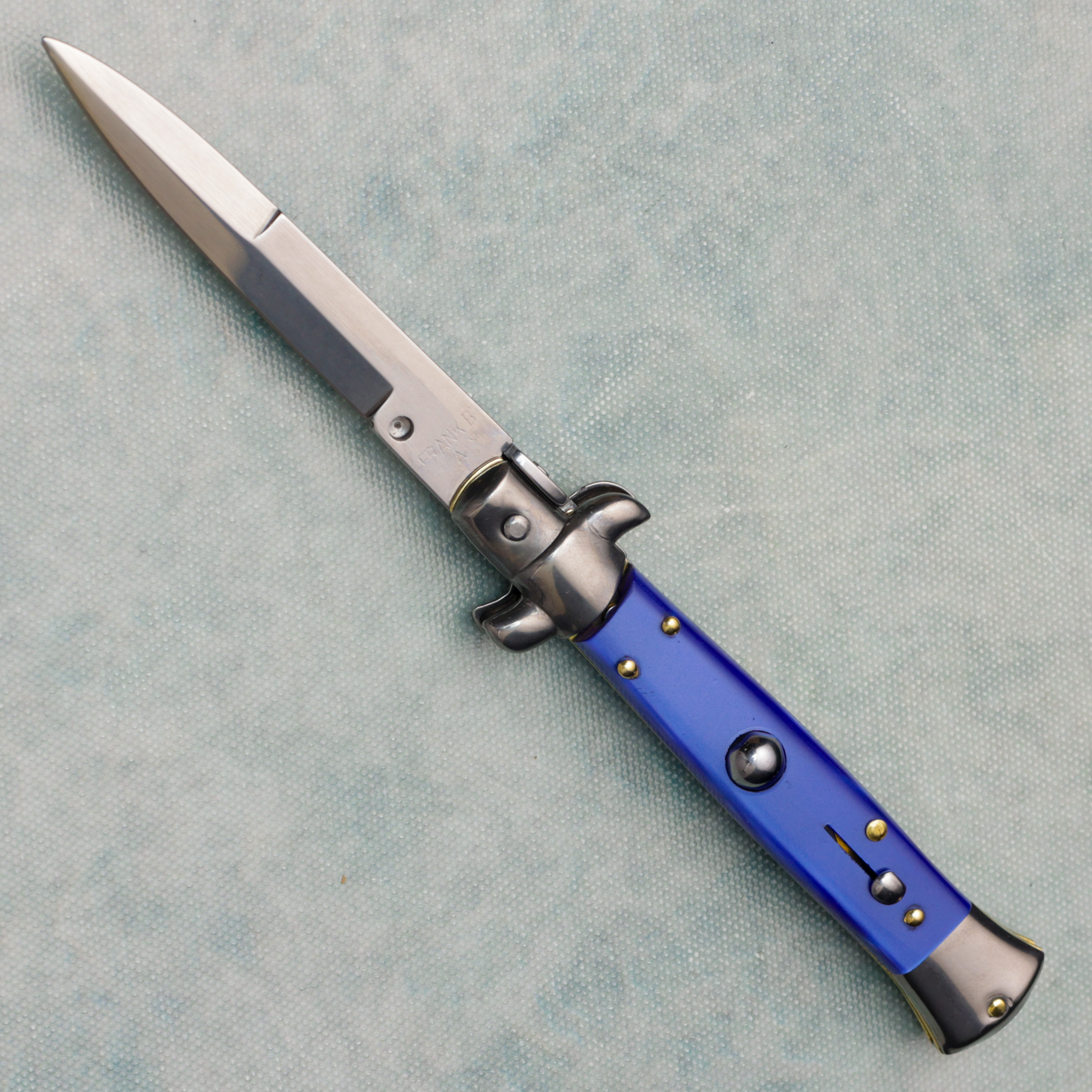 A classic among Italian knife collections, this 8" stiletto offers all of the features you'd come to expect to make this such a terrific part of any collection. The stainless steel bayonet blade has a polished finish and is stamped with "Frank B Italy" on the tang. The nickel silver bolsters are also polished, as are the release button and the sliding safety. The blue pearlex handles are gorgeous and nicely offset by the brass pins. and liners. The action is snappy and the lock up is secure. Brand new.