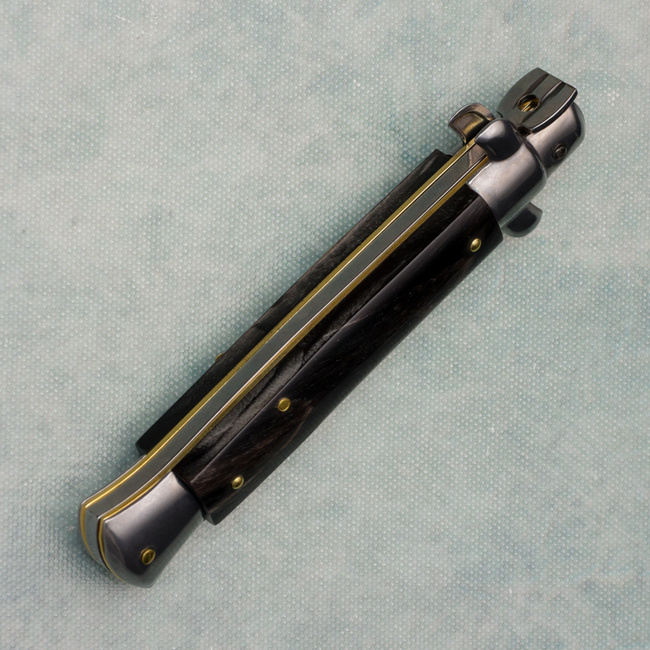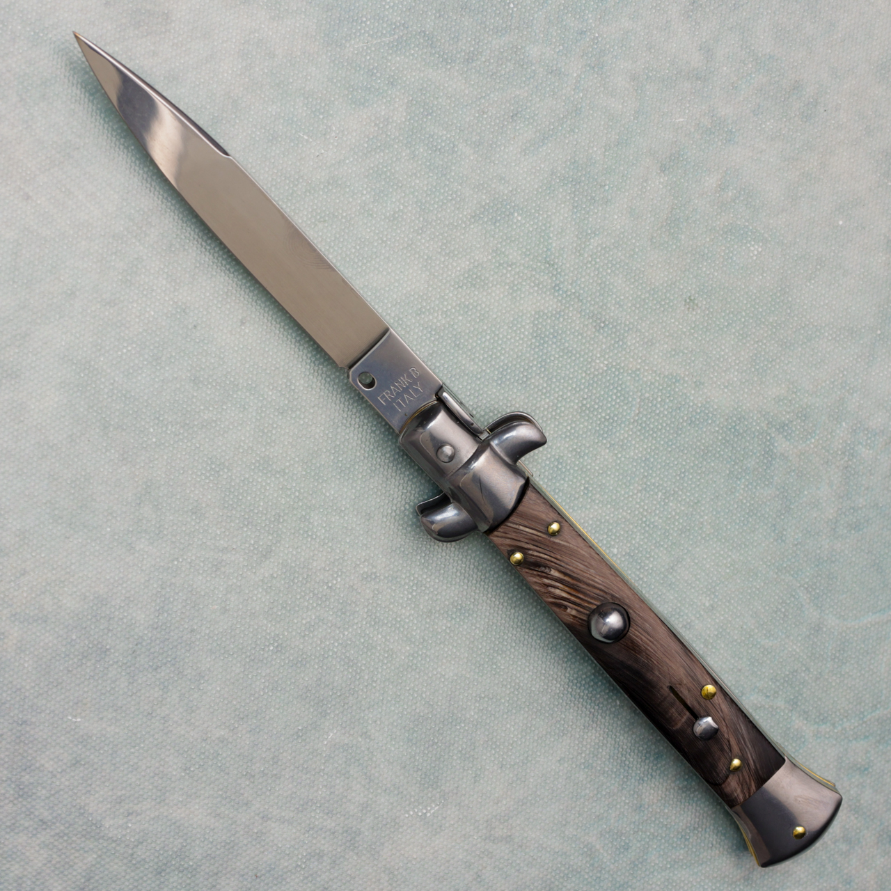 A classic among Italian knife collections, this 9" blade offers all of the features youd come to expect to make this such a terrific part of any collection. The stainless steel swedge blade has a polished finish and is  stamped with "Frank B Italy" on the tang. The nickel silver bolsters are also polished, as are the release button and the sliding safety. The horn handles are gorgeous and nicely offset by the brass pins. and liners. The action is snappy and the lock up is secure. Brand new.