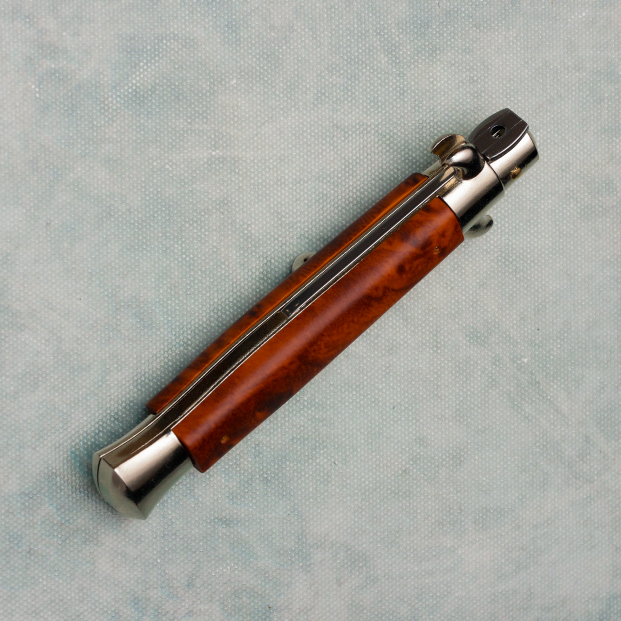 Frank Beltrame 9" Italian Stiletto Auto Imitation Wood Handles Polished Flat Blade
