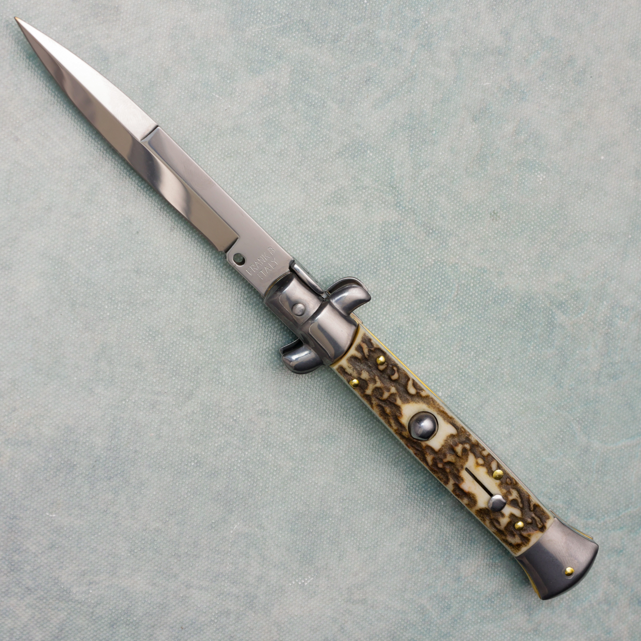 Frank Beltrame 9" Italian Stiletto Auto Stag Handles Polished Bayonet Blade