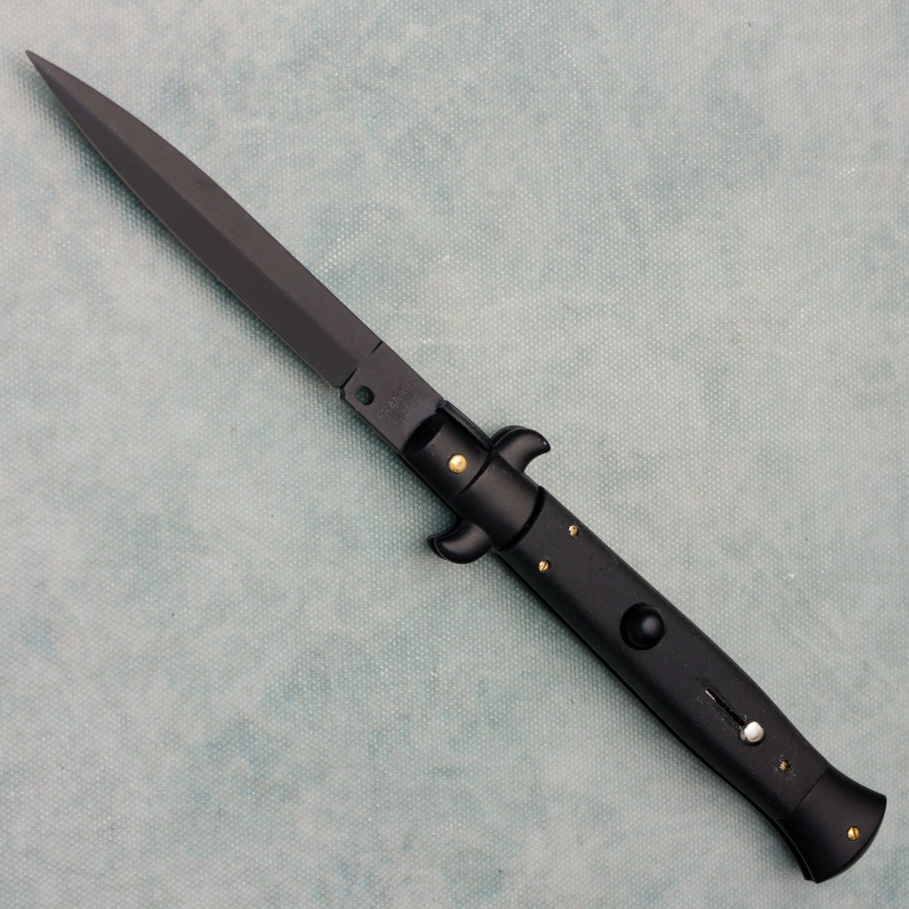 A classic among Italian knife collections, this 9" stiletto offers all of the features you'd come to expect to make this such a terrific part of any collection. The stainless steel flat blade has a black finish and is stamped with "Frank B Italy" on the tang. Teflon coated black synthetic handles. The action is snappy and the lock up is secure. Brand new.