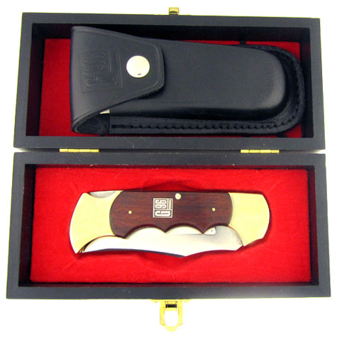 Finger grooved rosewood handle scales with inlaid G96 shield. Satin finished stainless steel clip point blade and saw blade. Brass bolsters, liners, and handle pins. This is a very handy and perfect hunting knife. Comes brand new in velvet lined black wood display box with brass engraving plate and black leather G96 sheath.