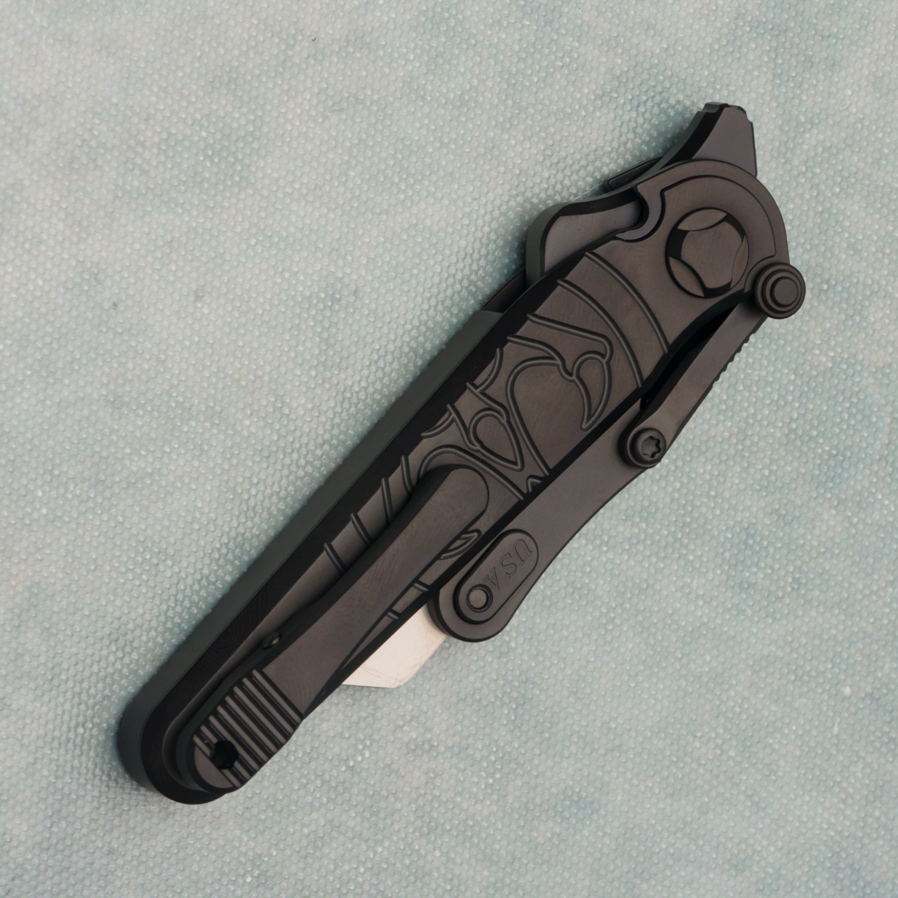 This model features black DLC titanium frame and flipper. A serrated utility blade comes on the knife itself, along with a secondary blade in the case. Brand new in tin box.