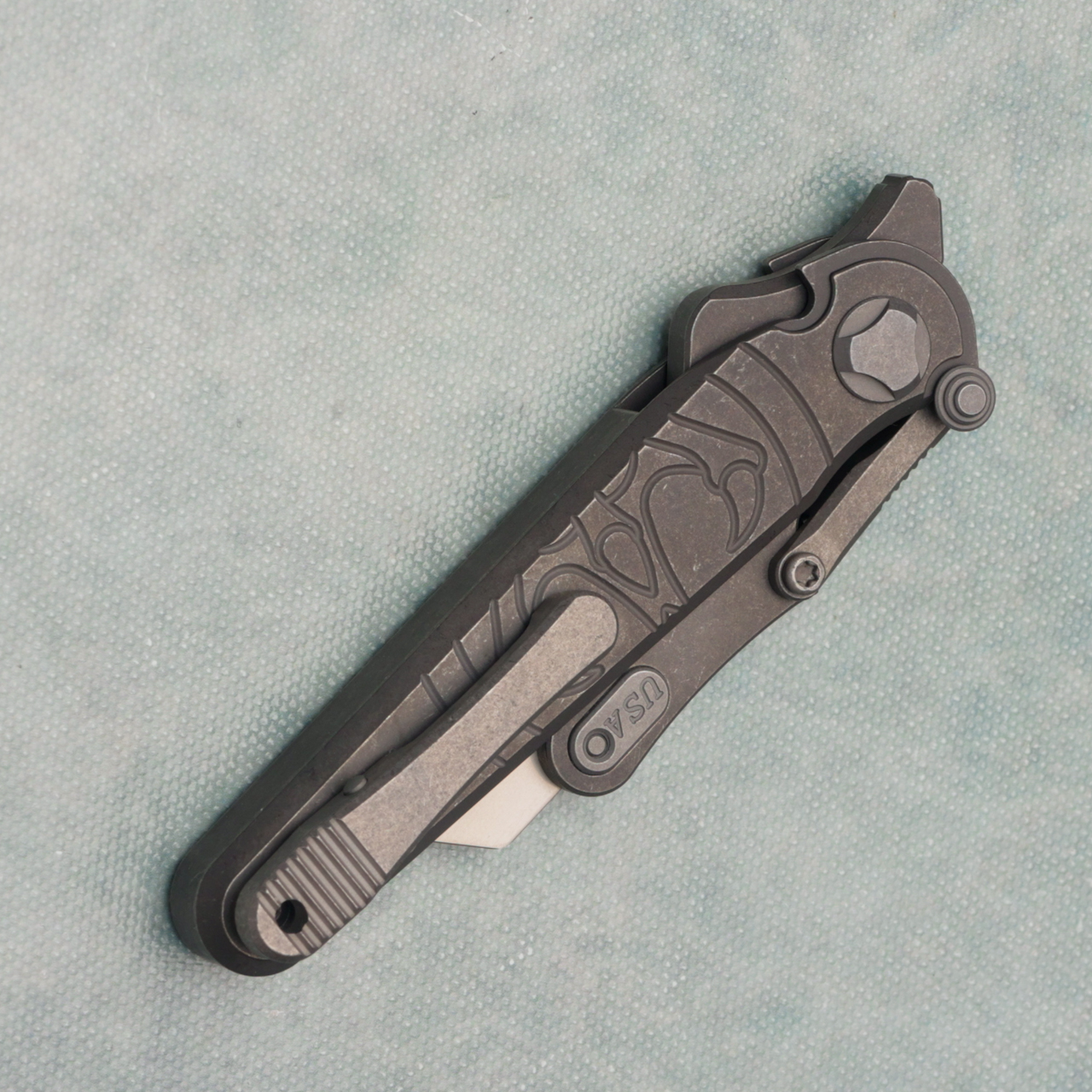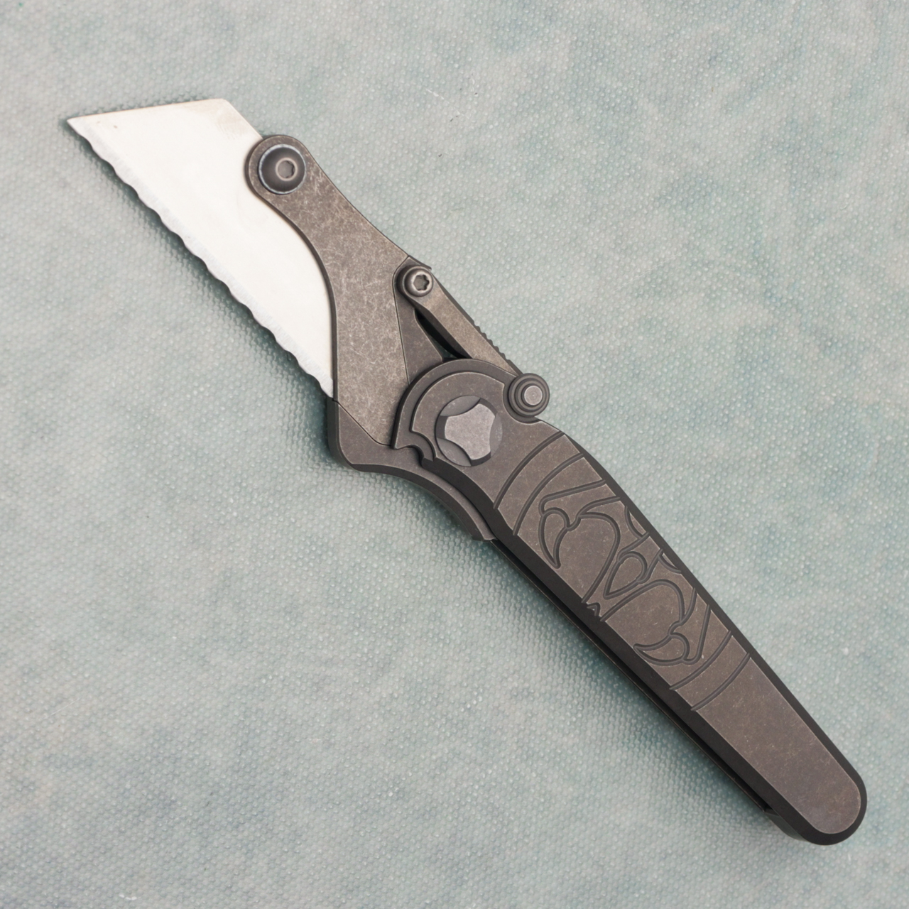 This model features stonewash titanium frame and flipper. A serrated utility blade comes on the knife itself, along with a secondary blade in the case. Brand new in tin box.