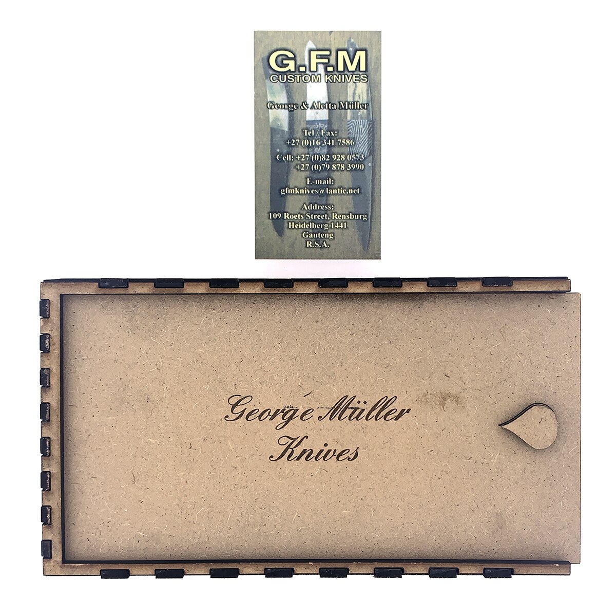 Excellent quality knife, handmade in South Africa by George Muller; a member of The Knifemakers Guild of Southern Africa. George Muller's knives excel in design and build. This frame lock flipper has thick gold anodized stonewash finished titanium handle scales with one genuine ruby inlaid on each side. The frame edges have a blue contrasting anodize. Matching blue and gold anodized titanium pocket clip for tip up carry. Blue anodized barrel spacers. Stonewash finished Bohler N690 stainless steel modified sheepsfoot blade. The blade is etched with George Muller's makers mark. The blade deploys with smooth action on a ceramic IKBS ball-bearing pivot system with a push of the flipper. New from maker in a presentation box with black zip up pouch.