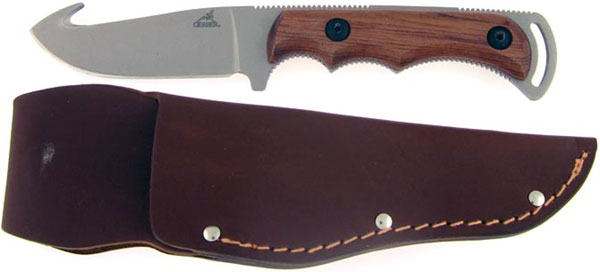 Removable sculpted pear wood handles. Bead blasted 440A stainless steel guthook skinner blade. Exposed full tang has jimping on top and bottom that provides for excellent grip. Lanyard slot. Designed by Brad Parrish and Jeff Freeman. Brand new in box with leather sheath.