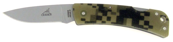 2010 Blade Show Gerber Knife. Awesome digital camouflage G-10 handles. Grey matte finished stainless steel drop point blade etched GERBER and was signed on the back by Pete Gerber at the 2010 Blade Show in Atlanta. Lanyard hole. This is a cool little light-weight camouflage lock-back pocket knife. Brand new.