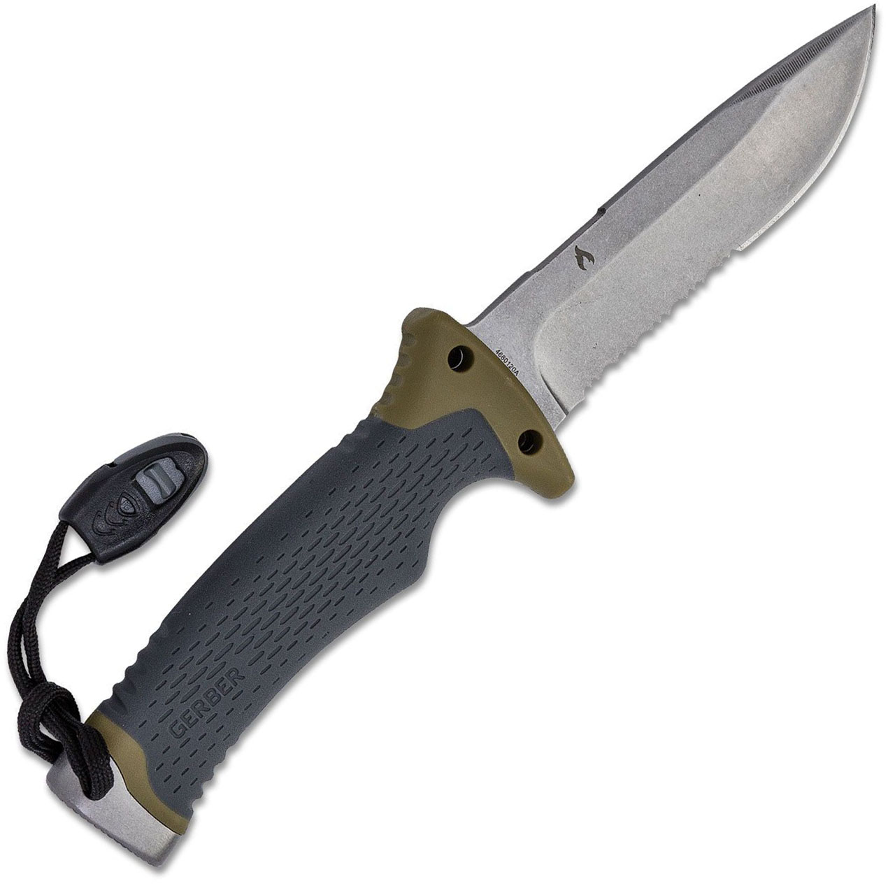 Loaded with innovations, this knife has everything. The Gerber Ultimate Survival Knife features a half serrated, drop point blade, a textured rubber grip, a steel hammer pommel, and an emergency whistle. The durable sheath has a sharpener and a firestarter. New in box