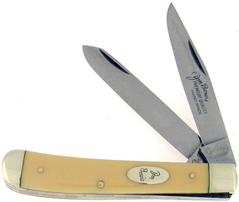 Smooth yellow delrin handle scales. Polished stainless steel clip point blade etched JIM BOWIE PREMIUM QUALITY HAND MADE and spey blade. Both blades have strong snap. Brass liners. Nickel silver bolsters, handle pins, and inlaid Jim Bowie logo shield. Another great German made pocket knife.