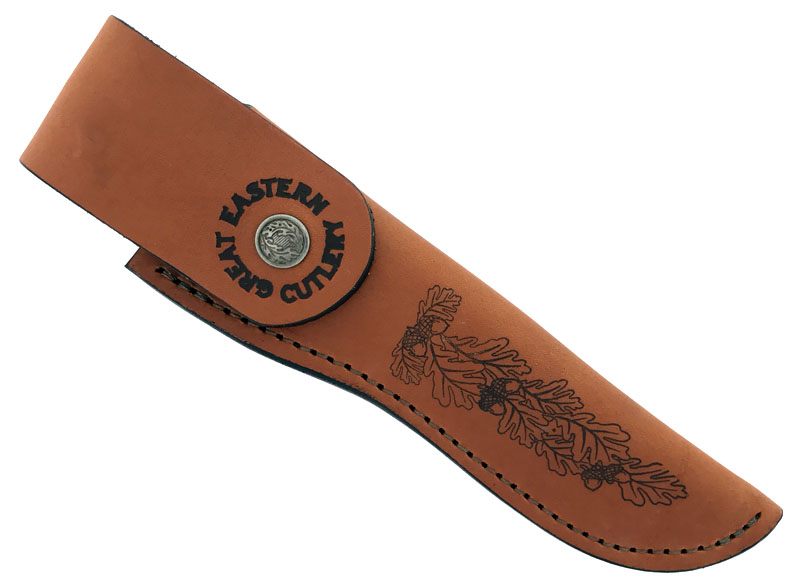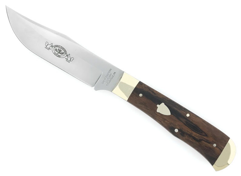 This is a canoe pattern hunter from Great Eastern Cutlery. This knife features a skinning style 1095 carbon steel clip point blade; perfect for dressing medium sized game and working around camp. Beautiful exotic Mexican Bocote wood with inlaid nickel silver acorn shield. The blade is etched with the Great Eastern Cutlery Trademark logo. Tang Stamped GREAT EASTERN CUTLERY TITUSVILLE, PA on front and TITUSVILLE IRON WORKS H23310 on back. Nickel silver bolsters and handle pins. Brass liners. Comes brand new in brown leather sheath in original packaging.