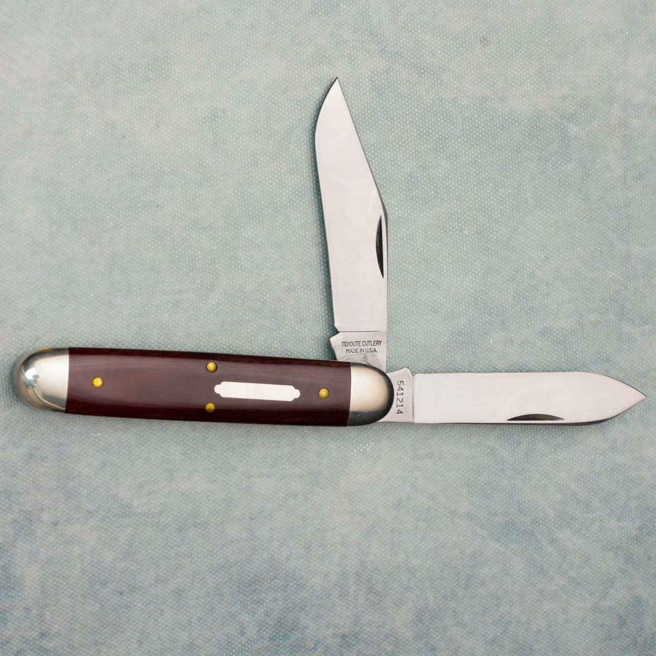 The Big Jack features a maroon linen micarta handle, and 2 blades. Nickel silver bolsters and brass liners add a classic flair to the design. Brass pins and a nickel silver inlay finish of the stunning Big Jack design from Tidioute Cutlery. Brand new in tube.