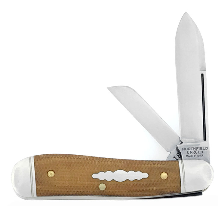 Awesome natural canvas micarta handle scales. Satin finished 1095 carbon steel swedged spear point blade with long nail pull etched and a coping blade. Both blades have good strong open, close and half snap. Brass liners and handle pins. Nickel silver pinched and fluted bolsters and inlaid bowtie shield. The Beagle is a cool pattern that was proudly made in Tittusville, Pennsylvania U.S.A. in 2016. Brand new in round tube.