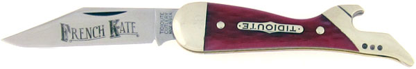 Beautiful fuchsia jigged bone handle scales. Satin finished 1095 carbon steel clip point blade etched FRENCH KATE - GREAT EASTERN CUTLERY 1 OF 25 PPP. The blade has good snap. Brass liners. Awesome nickel silver bolsters that work with the handle scales on this knife to give it the look of a ladies leg, the bottom bolster is shaped like the heel and is fluted. This knife is serial numbered #20 of the 25 Pre Production Prototypes. Proudly made in Tittusville, Pennsylvania U.S.A. Comes brand new in a round tube.