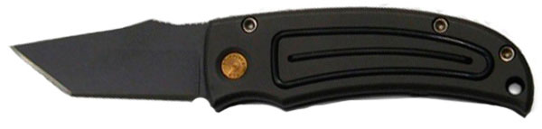 Black aircraft aluminum handles with rubber rope grip inserts. High quality black coated ATS-34 stainless steel tanto blade with jimping on the spine. Inlaid GT knives U.S.A. brass push button for the auto opening which hits hard and locks out firm. Lanyard hole. Awesome little U.S.A. made automatic knife. Comes brand new in box.