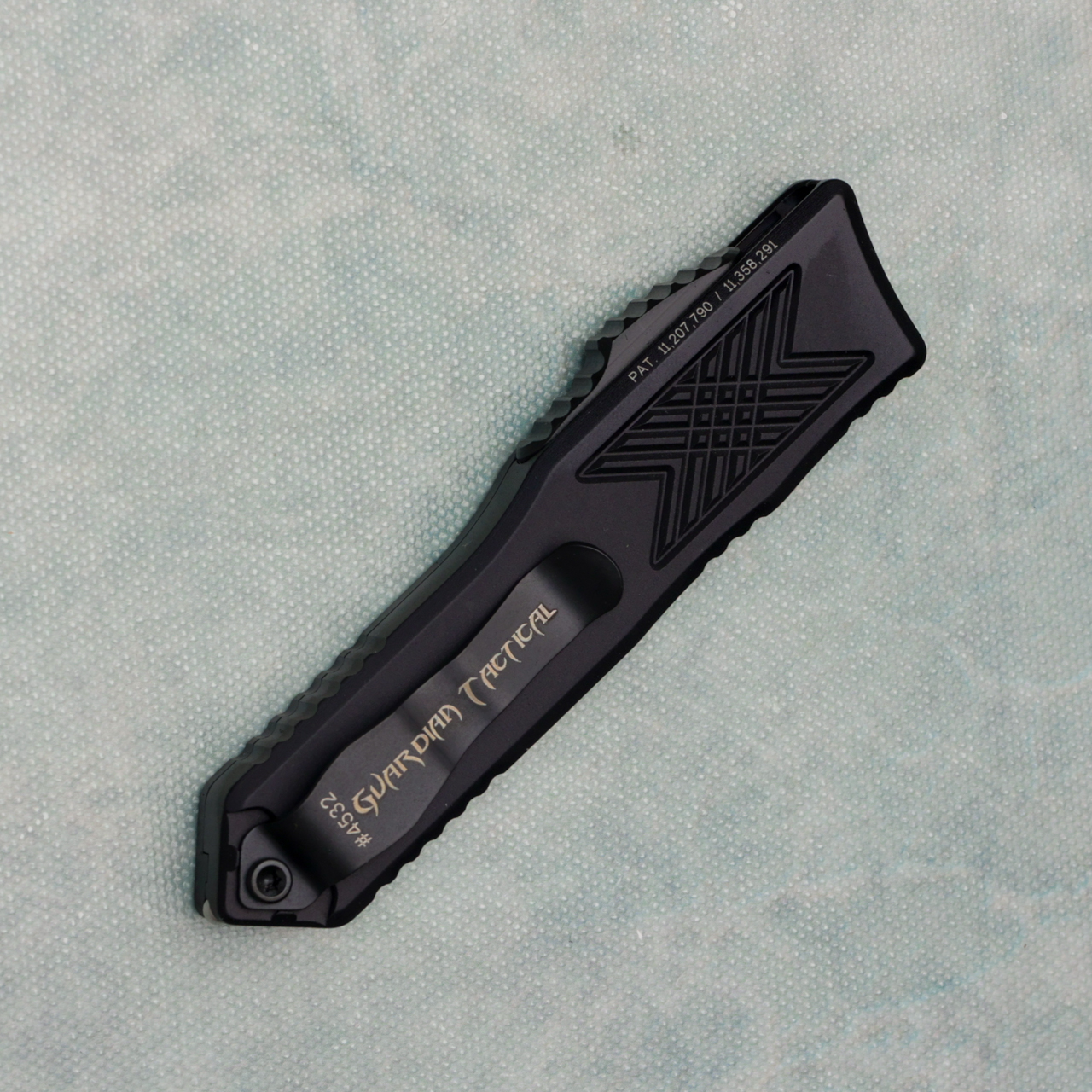This model features black anodized 6061-T6 aluminum handle scales etched with the model information. Black finished ELMAX stainless steel double edge blade. Black finished hardware and pocket clip with the Guardian Tactical logo and serial number. Brand new in box.