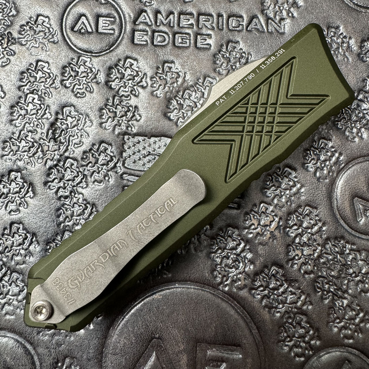 This model features od green anodized 6061-T6 aluminum handle scales etched with the model information. Stonewashed finished ELMAX stainless steel single edge blade. Stonewashed finished hardware and pocket clip with the Guardian Tactical logo and serial number. Brand new in box.