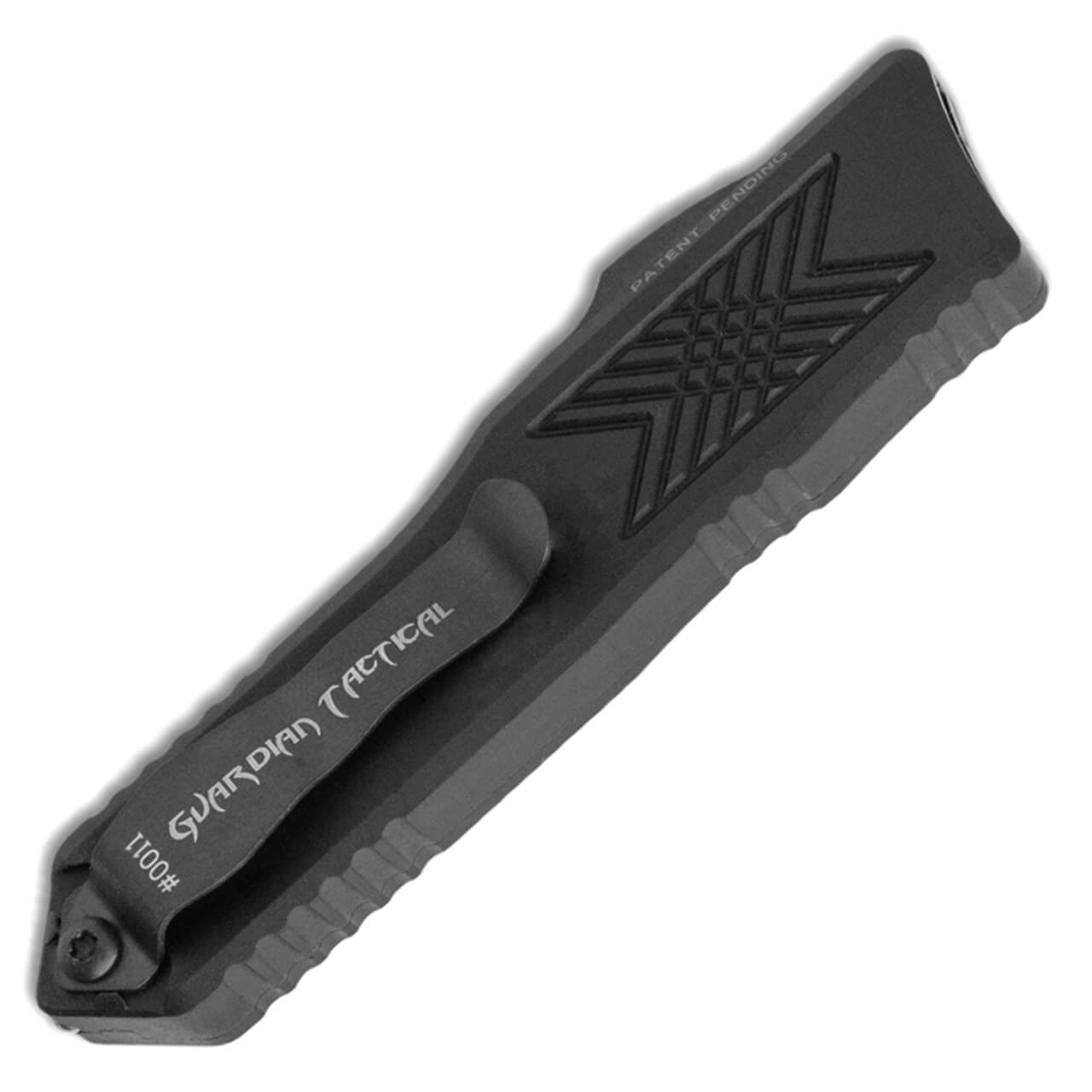 This model features black anodized 6061-T6 aluminum handle scales etched with the model information. Black finished ELMAX stainless steel single edge drop point blade. Black finished hardware and pocket clip with the Guardian Tactical logo and serial number. Brand new in box.