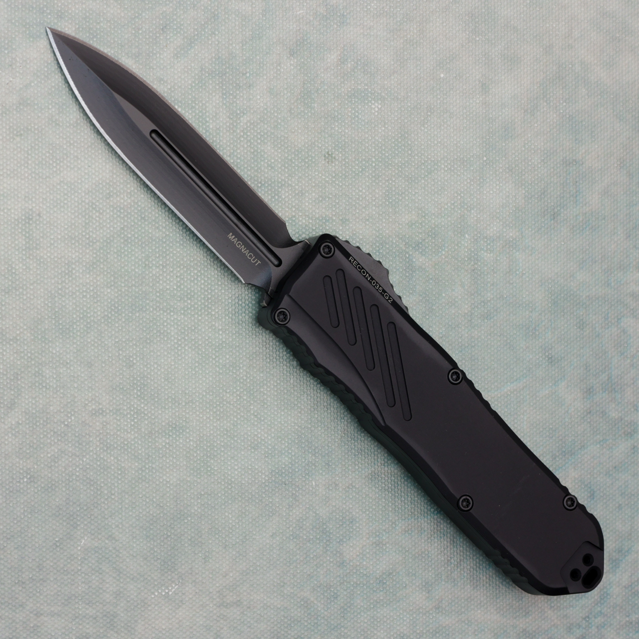 This new RECON-035 Gen 2 model features black anodized 6061-T6 aluminum handle scales. Black tactical finished CPM-MagnaCut stainless steel double edge blade. All black finished hardware and pocket clip with the Guardian Tactical logo and serial number. Brand new in box.