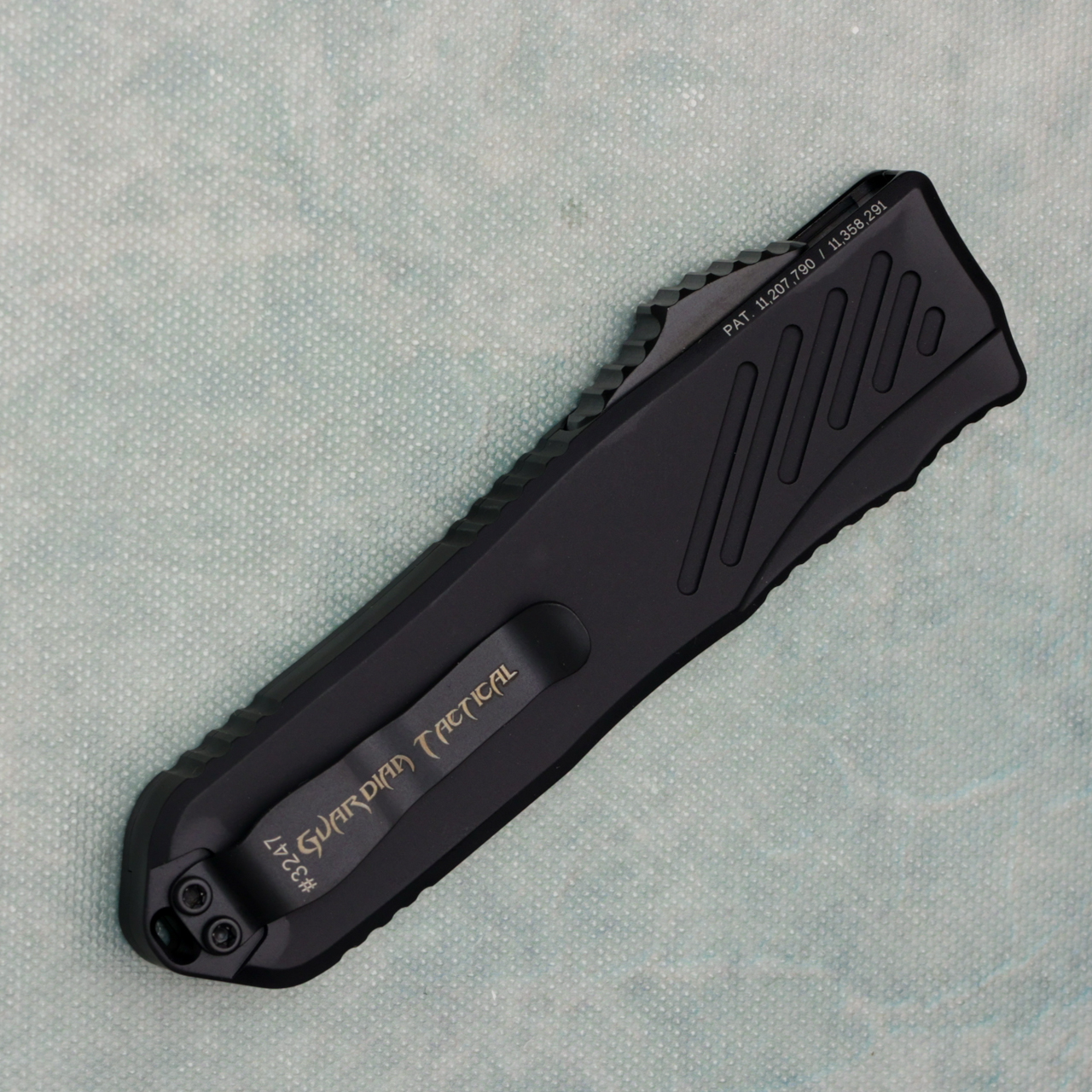 These brand new OTF automatic knives by Guardian Tactical are sure to impress. Super smooth and responsive action with their patented OTF mechanism. The well designed thumb slide rides on a steel plate with 3 ceramic balls that eliminate wear and tear. A new innovative locking mechanism is placed off center from the blade channel to avoid drag against the blade when operating the action. These features combined in this package remedy the friction that has caused problems with OTF knives since the beginning. The RECON-035 is an excellent EDC size as well. Includes a deep carry pocket clip and an integral lanyard hole. 100% made in the USA!