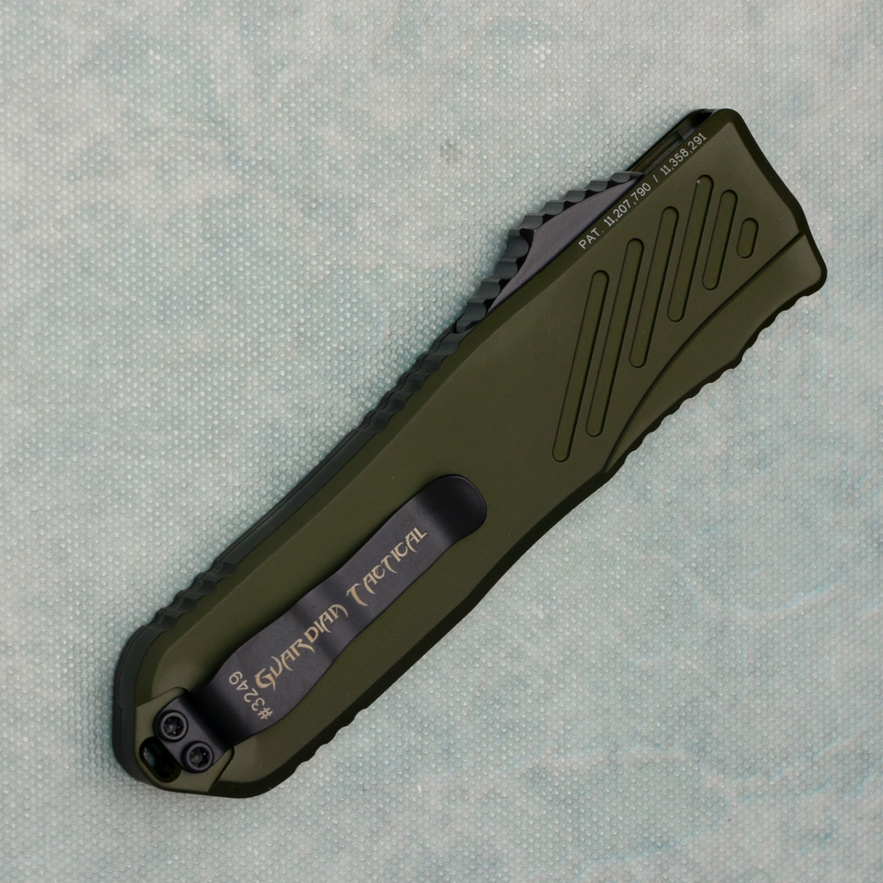 This new RECON-035 Gen 2 model features OD green anodized 6061-T6 aluminum handle scales. Black finished CPM-MagnaCut stainless steel tanto blade. All black tactical finished hardware and pocket clip with the Guardian Tactical logo and serial number. Brand new in box.