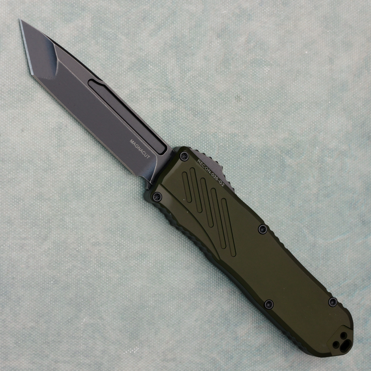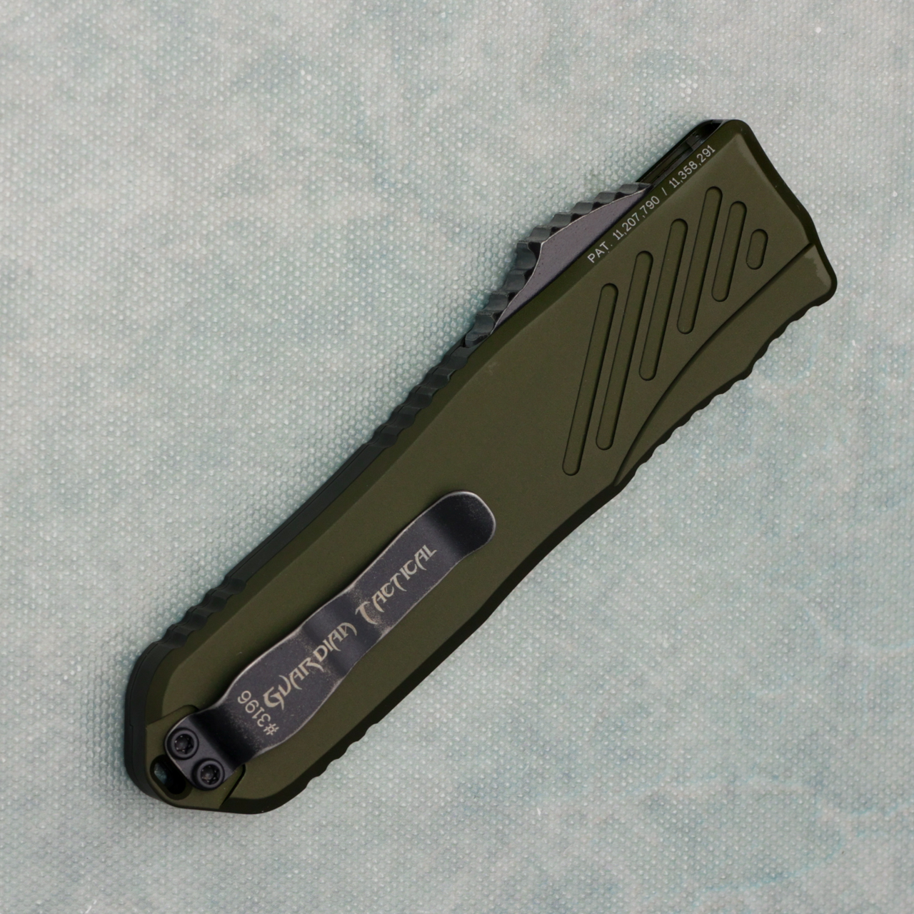 This new RECON-035 Gen 2 model features od green anodized 6061-T6 aluminum handle scales. Dark stonewash finished CPM-MagnaCut stainless steel tanto blade. All dark stonewashed finished hardware and pocket clip with the Guardian Tactical logo and serial number. Brand new in box.