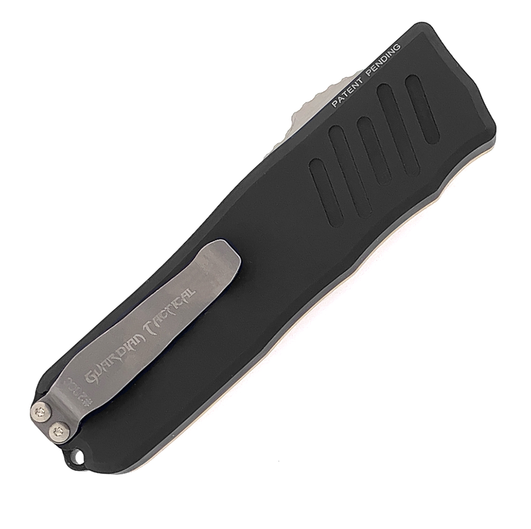 The Recon-035 OTF automatic knives by Guardian Tactical are sure to impress. Super smooth and responsive action with their patented OTF mechanism. The well designed thumb slide rides on a steel plate with 3 ceramic balls that eliminate wear and tear. A new innovative locking mechanism is placed off center from the blade channel to avoid drag against the blade when operating the action. These features combined in this package remedy the friction that has caused problems with OTF knives since the beginning. The RECON-035 is an excellent EDC size as well. Includes a deep carry pocket clip and an integral lanyard hole. 100% made in the USA!