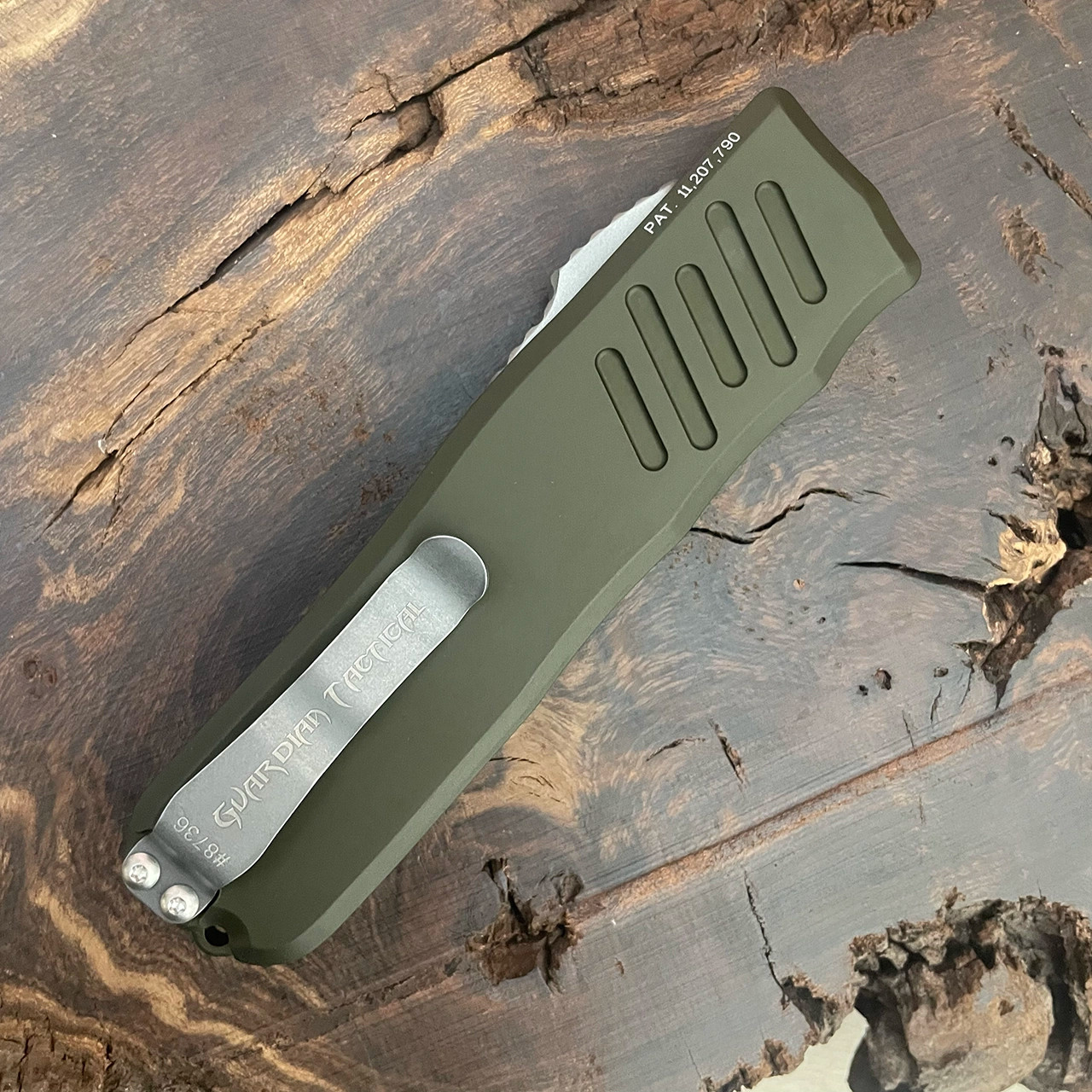 This RECON-035 model features OD Green anodized 6061-T6 aluminum handle scales etched "RECON-035 - PATENT PENDING". Stonewash finished ELMAX stainless steel tanto blade. All bead blast finished hardware. Stonewash finished pocket clip with the Guardian Tactical logo and serial number. Brand new in box.