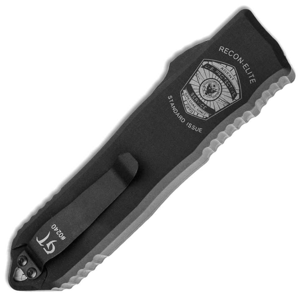 The RECON series OTF automatic knives by Guardian Tactical are sure to impress. Super smooth and responsive action with their patented OTF mechanism. The well designed thumb slide rides on a steel plate with 3 ceramic balls that eliminate wear and tear. A new innovative locking mechanism is placed off center from the blade channel to avoid drag against the blade when operating the action. These features combined in this package remedy the friction that has caused problems with OTF knives since the beginning. The RECON ELITE is a big beefy knife that was made for the U.S. Protective Service. Includes a pocket clip, glass breaker, and an integral lanyard hole. 100% made in the USA!