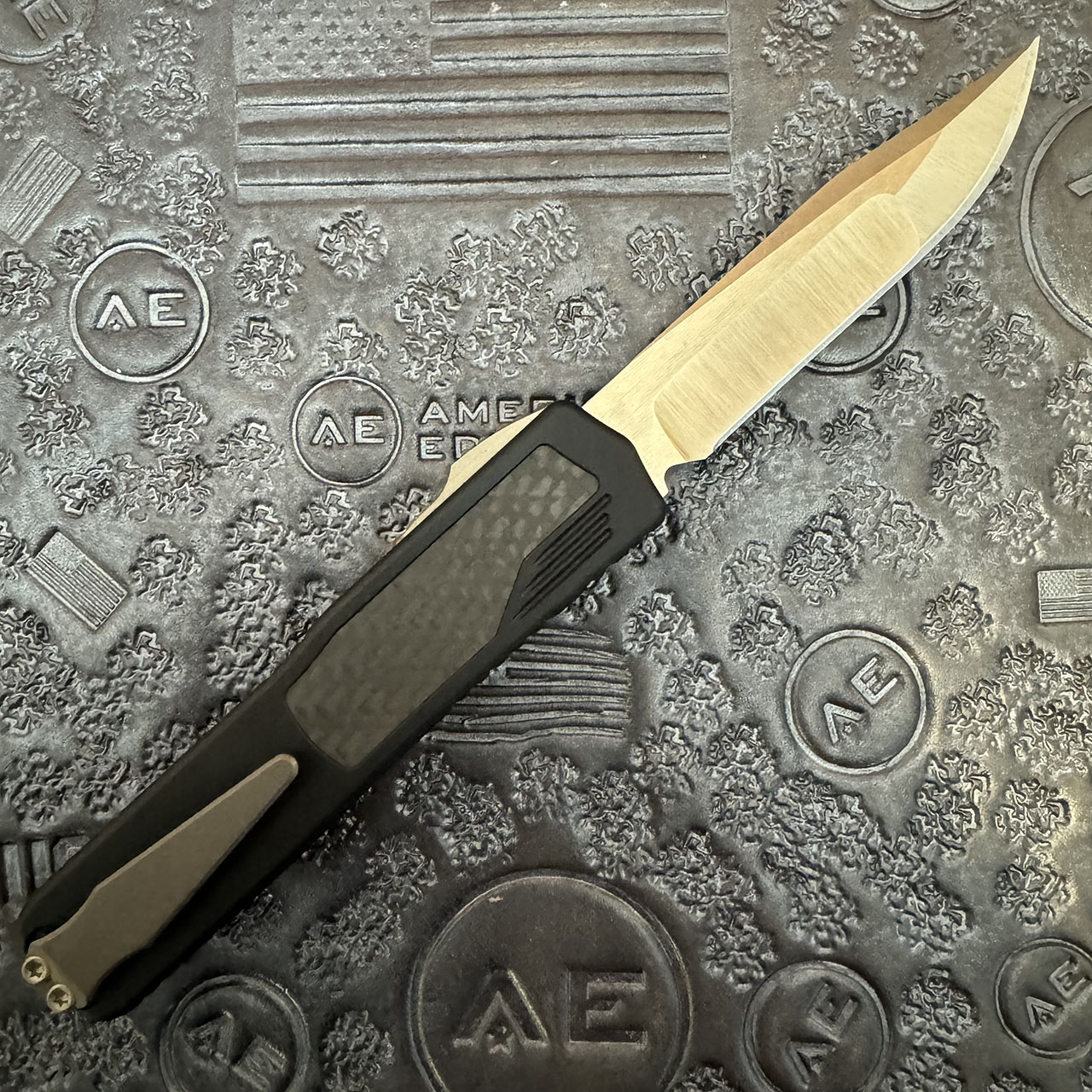 This model features black 6061-T6 aluminum handle scales with carbon fiber inlays. Reese Weiland hand ground bronzed satin ELMAX stainless steel blade. Matching finished hardware and pocket clip. Brand new in box.