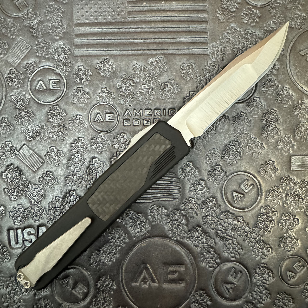 This model features black 6061-T6 aluminum handle scales with carbon fiber inlays. Reese Weiland hand ground satin ELMAX stainless steel blade. Matching finished hardware and pocket clip. Brand new in box.