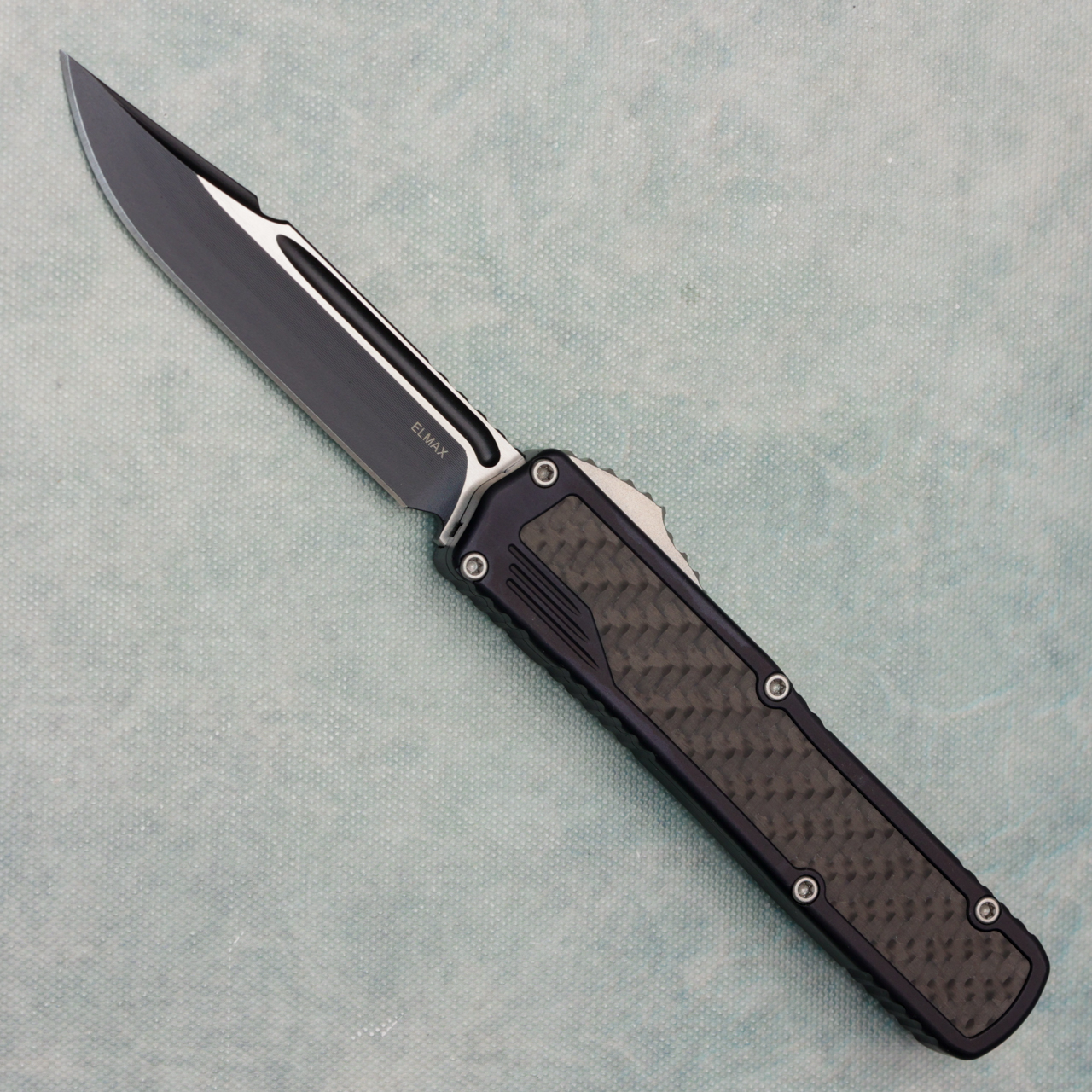 This model features black anodized 6061-T6 aluminum handle scales with carbon fiber inlays. Two-tone black finished ELMAX stainless steel blade. Bead blast finished hardware and pocket clip. The blade is marked with the steel designation and the pocket clip is marked with the Guardian Tactical logo. Brand new in box.