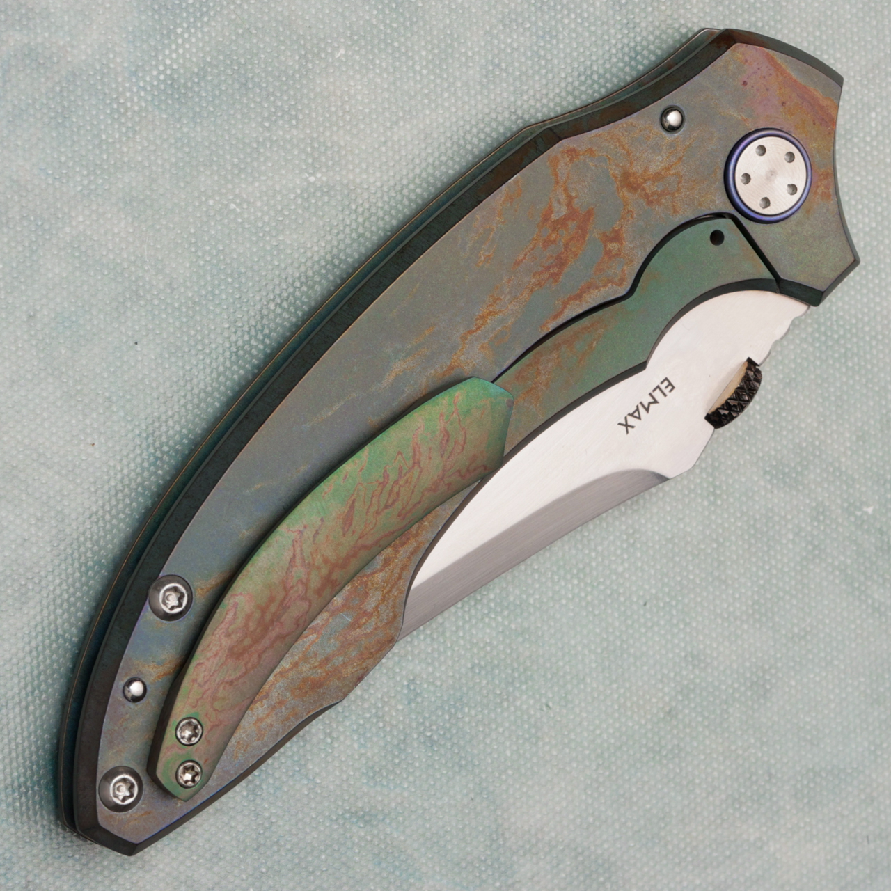 This custom battlecraft from Harm Edged Tools has a satin Elmax blade, lightning titanium handles, satin hardware, lightning ti clip, and blurple thumbdisk opener. These are beautiful custom frame locks! Brand new from maker with leather zip up pouch.