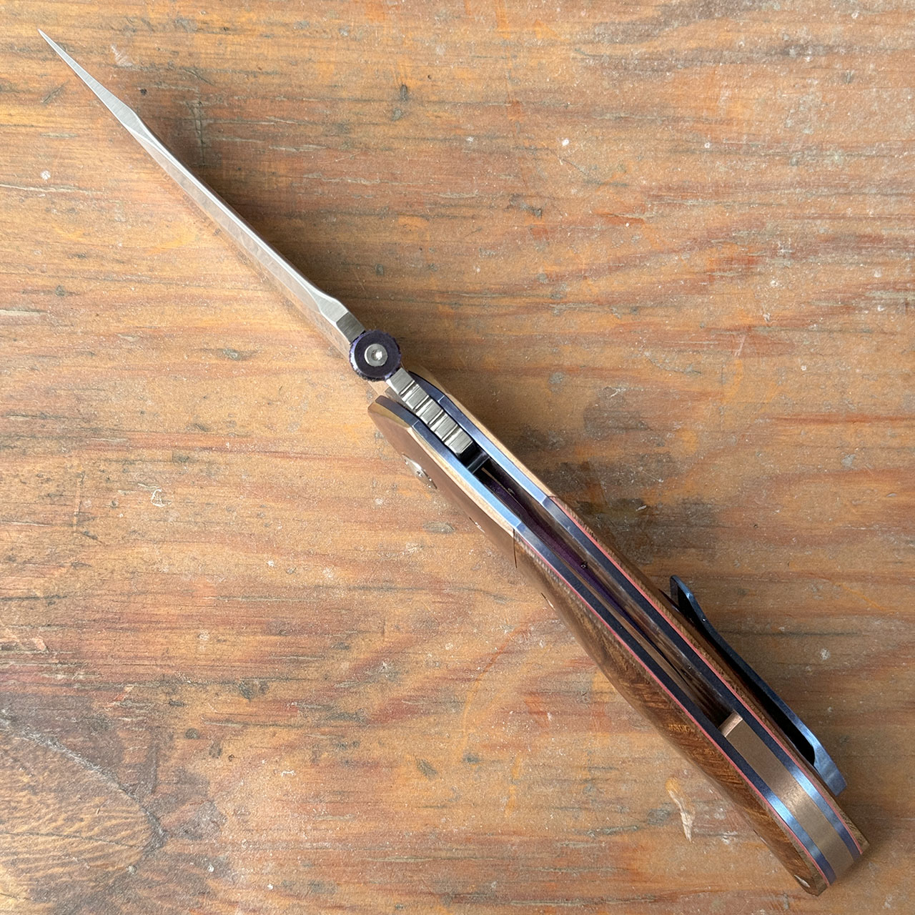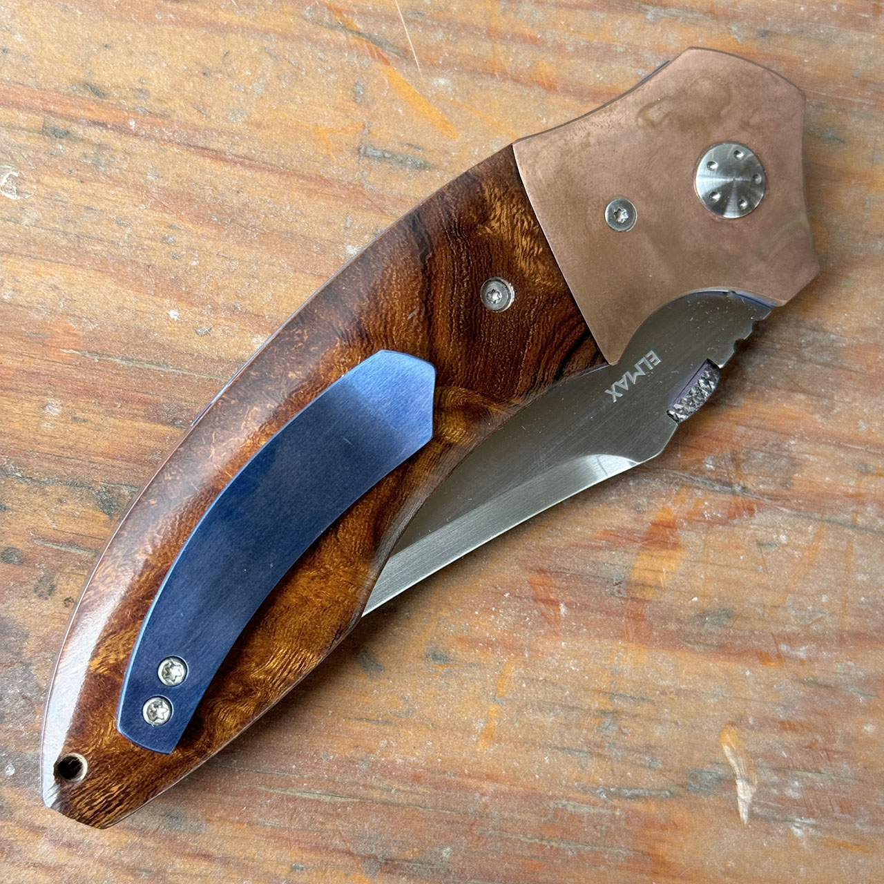 This custom battlecraft from Harm Edged Tools has a satin Elmax blade, desert ironwood handles with copper bolsters, copper backspacer, satin hardware, and a blue titanium pocket clip and liners. Blue thumbdisk opener. These are beautiful custom liner locks! Brand new from maker with leather zip up pouch.