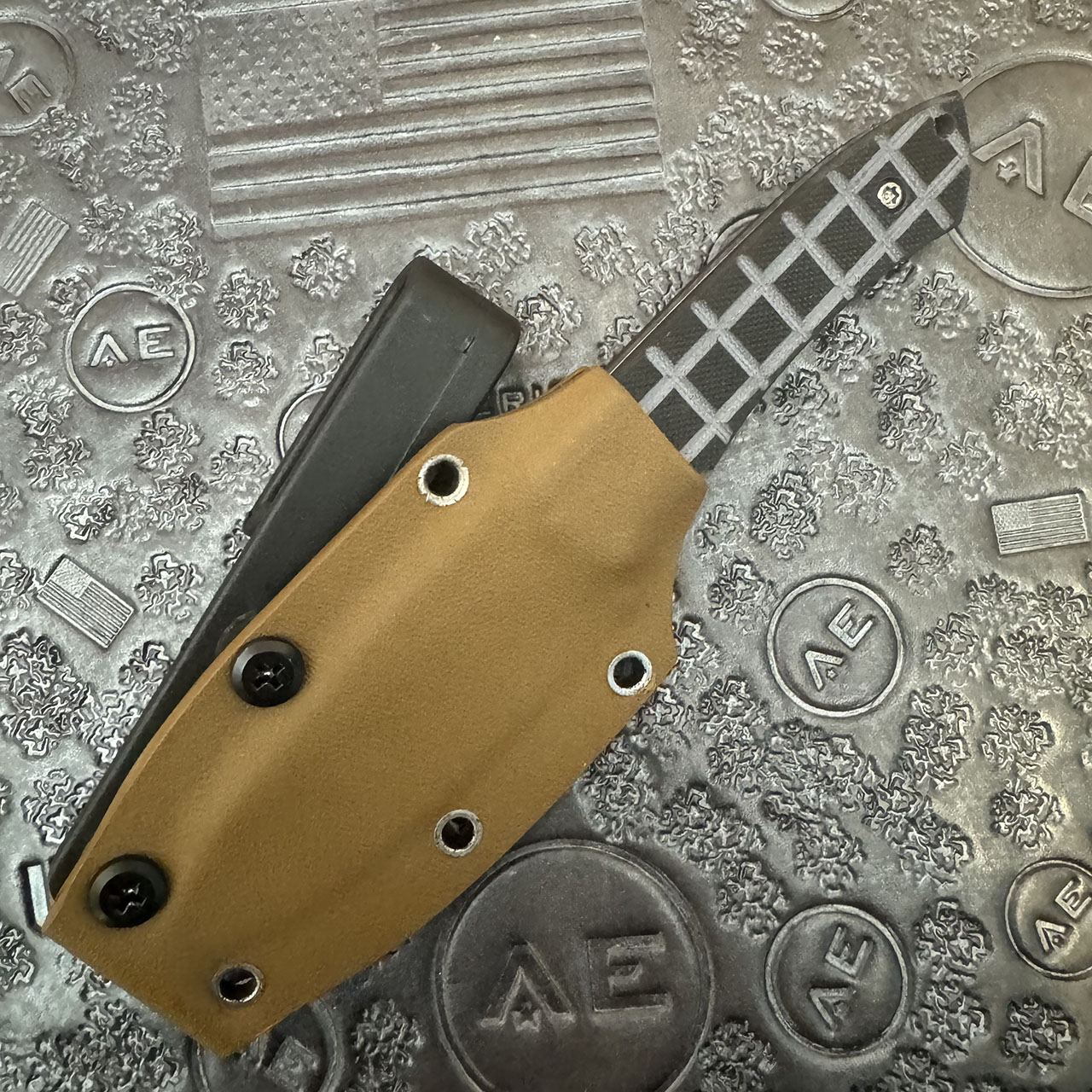This custom Micro XL from Harm Edged Tools has a satin M390 blade, and grenade textured black G10 handles. Comes with tan kydex sheath. These are beautiful custom fixed blades and fit the hand so well! Brand new from maker with leather zip up pouch.