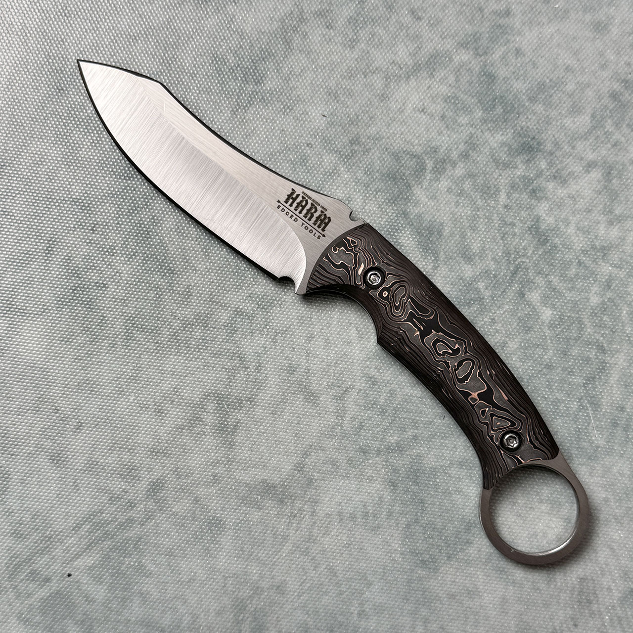 Harm Edged Tools Custom SD Ring Fixed Blade Copper Carbon Fiber Handles Satin Blade
